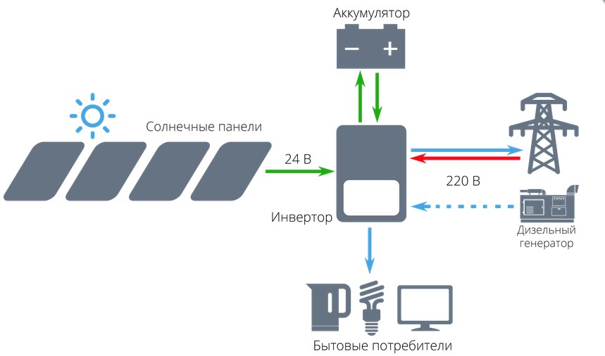 - Гибридные электростанции. Гибридные электростанции оснащены аккумулятором и, в то же время, предусматривают подключение к наружным сетям. По стоимости оборудования это – самый дорогой вариант. Но такая солнечная станция обеспечивает максимальный комфорт для пользователя. Она эксплуатируется как в автономном режиме (для обеспечения потребностей домовладения), так и режиме продажи электроэнергии.