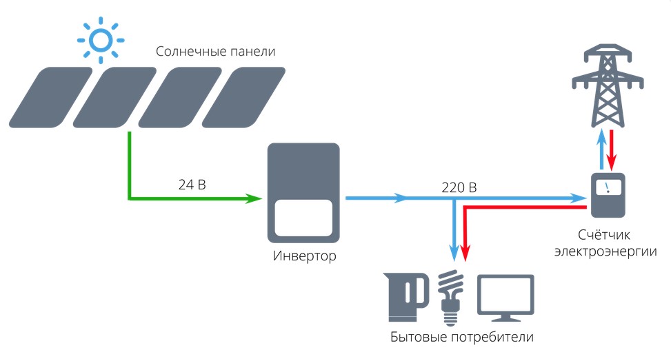 - Сетевая солнечная электростанция. Этот вид оборудования, как правило, используется без аккумуляторных батарей. Основное предназначение таких станций – коммерческое (продажа электричества по «зеленому тарифу). В плане стоимости оборудования сетевая электростанция – наиболее дешевый вариант. Но, поскольку она подключается к внешним электросетям, то не может обеспечить автономность. В случае аварии на линии подача электричества в дом будет прекращена.