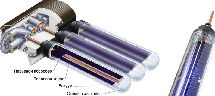 - Вакуумные коллекторы. В вакуумных моделях адсорбер заменен стеклянными трубками, которые изнутри покрыты отражающим слоем. В них расположен трубчатый теплообменник с теплоносителем. Лучи солнца проходят сквозь стекло, отражающий слой задерживает тепло внутри, за счет чего и нагревается теплоноситель. Вакуумный солнечный коллектор для отопления хорошо проявляет себя в зимнее время. Он эффективно работает под рассеянными лучами солнца в условиях частичной облачности.