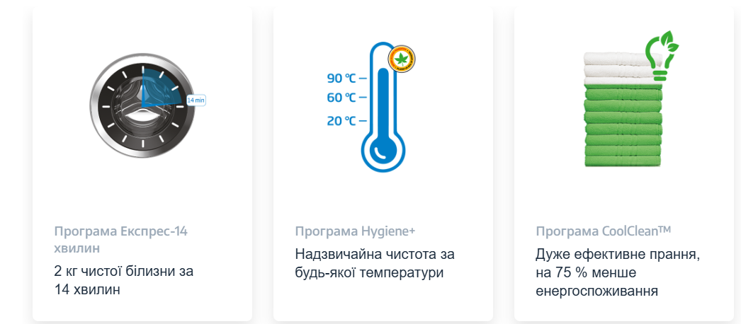 Якщо ви не хочете чекати цілу вічність, доки пральна машина закінчить свою роботу, спробуйте програму Daily Xpress. У режимі Daily Xpress ви зможете випрати повний комплект білизни лише за 28 хвилин за температури 30 °C. Прання закінчиться ще до того, як ви встигнете подивитися чергову півгодинну серію улюбленого серіалу.