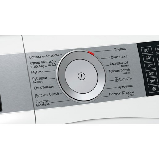 Большой сенсорный светодиодный дисплей для индикации хода программы, избранных дополнительных опций, уровня температуры, количества оборотов отжима, остаточного времени стирки, отсрочка старта стирки на 1 - 24 и рекомендаций о загрузки