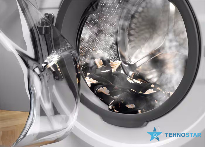 Модель оснащена інверторним двигуном, що забезпечує тиху та енергоефективну роботу, знижуючи рівень шуму до 74 дБ під час віджиму. Це дозволяє використовувати машину навіть у вечірній час, не турбуючи оточуючих.