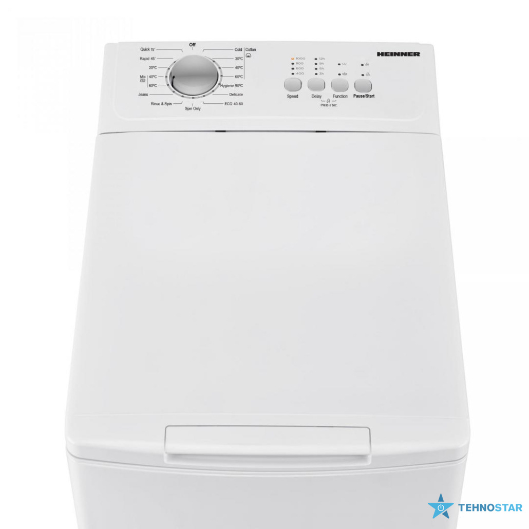 Пральна машина HEINNER HWM-TL6010C++ з вертикальним завантаженням, місткість 6 кг, швидкість віджиму 1000 об/хв, клас енергоефективності C, 15 програм, світлодіодний дисплей, швидка програма 15 хв, коротка програма 45 хв, гігієнічна програма 90°C, делікатний режим, додаткове полоскання, попереднє прання, функція відкладеного запуску, перемикач швидкості віджиму, захист від дітей,.