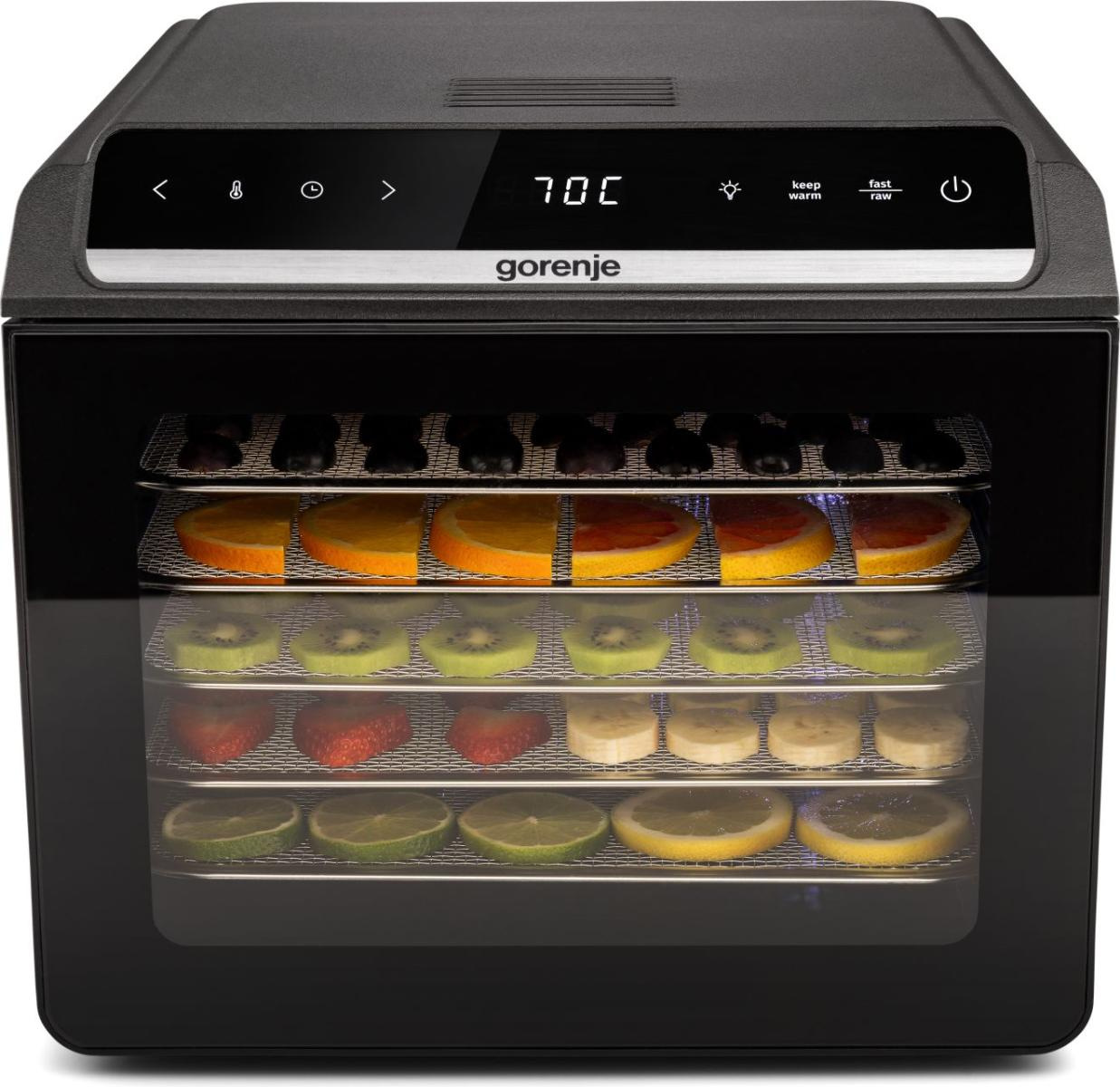 Сушарка для продуктів Gorenje FDK600DB із потужністю 580 Вт та 6 лотками діаметром 25 см забезпечує рівномірне висушування на всіх рівнях. Має LED-дисплей, електронне керування, регулювання часу від 0,5 до 48 годин та температури від 35 °C до 75 °C. Підходить для сушіння фруктів, овочів, м’яса, грибів, риби та домашнього печива.
