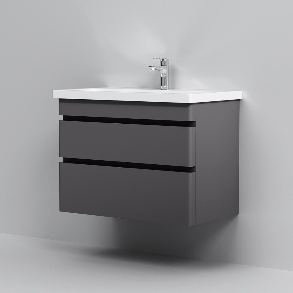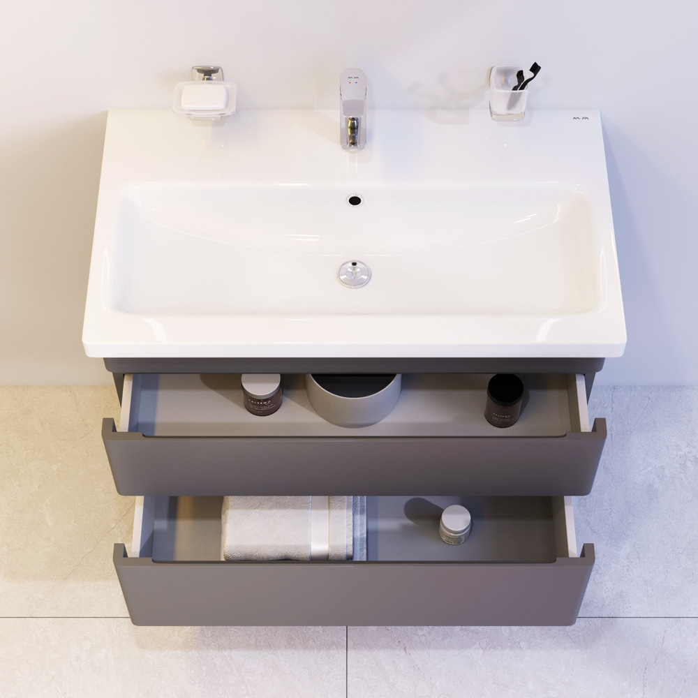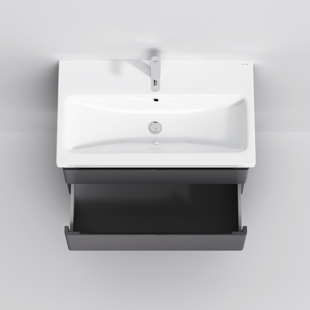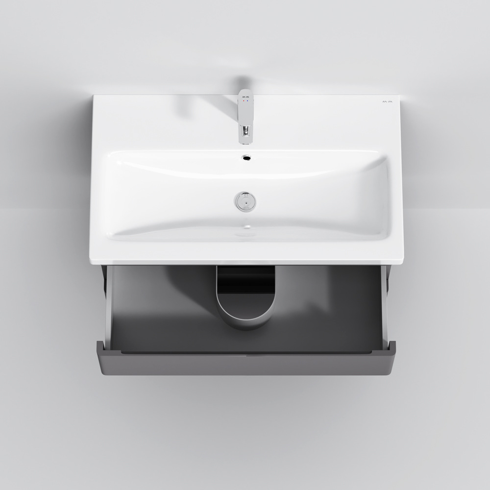 Новинка меблі для ванної Hit. Фасади в кольорі графіт покриті екологічно чистими і довговічними поліакриловими емалями, які наносяться за спеціальною технологією фарбування в 7 шарів. Це забезпечує насичений колір протягом усього терміну служби (від 10 років). М'яке відкриття і закриття ящиків забезпечують напрямні прихованого монтажу з системою м'якого закривання soft close. Тумба комплектується раковиною з склоподібного фарфору, самого гігієнічного і вологостійкого матеріалу. Це найкомпактніша і функціональна раковина на ринку: проекція всього 42 см при максимальній глибині чаші!