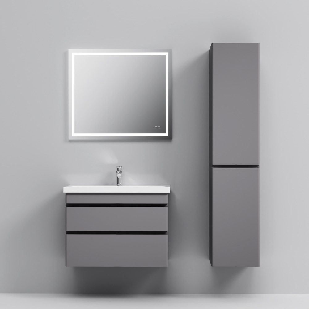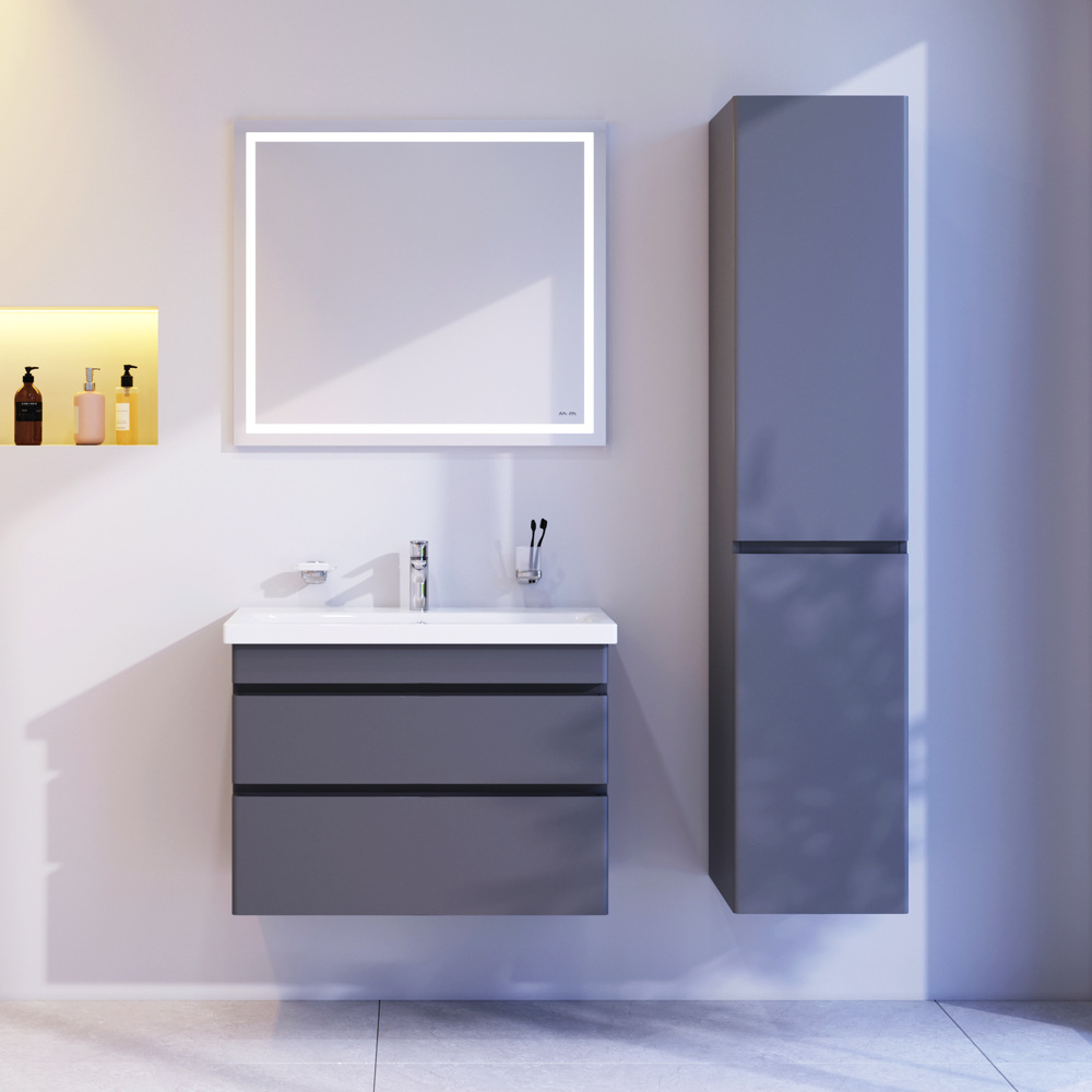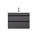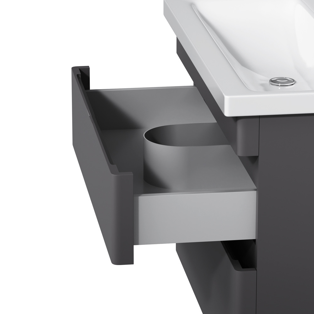 Новинка меблі для ванної Hit. Фасади в кольорі графіт покриті екологічно чистими і довговічними поліакриловими емалями, які наносяться за спеціальною технологією фарбування в 7 шарів. Це забезпечує насичений колір протягом усього терміну служби (від 10 років). М'яке відкриття і закриття ящиків забезпечують напрямні прихованого монтажу з системою м'якого закривання soft close. Тумба комплектується раковиною з склоподібного фарфору, самого гігієнічного і вологостійкого матеріалу. Це найкомпактніша і функціональна раковина на ринку: проекція всього 42 см при максимальній глибині чаші!