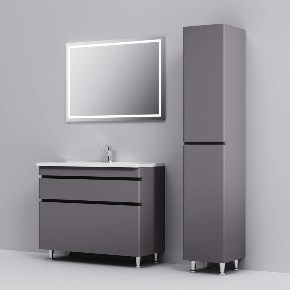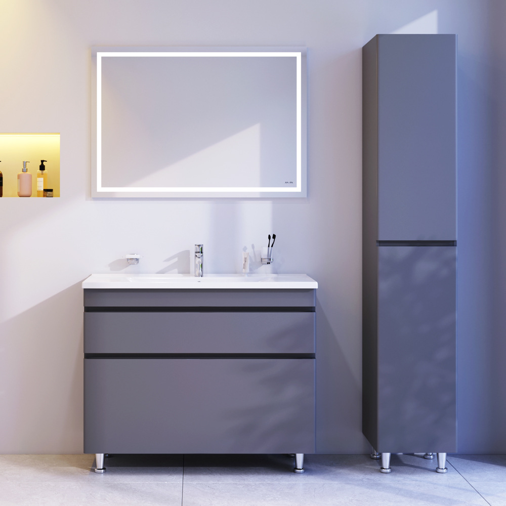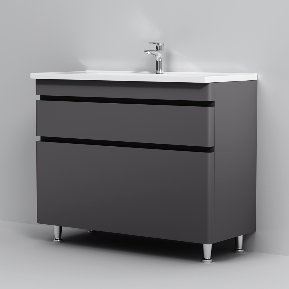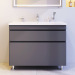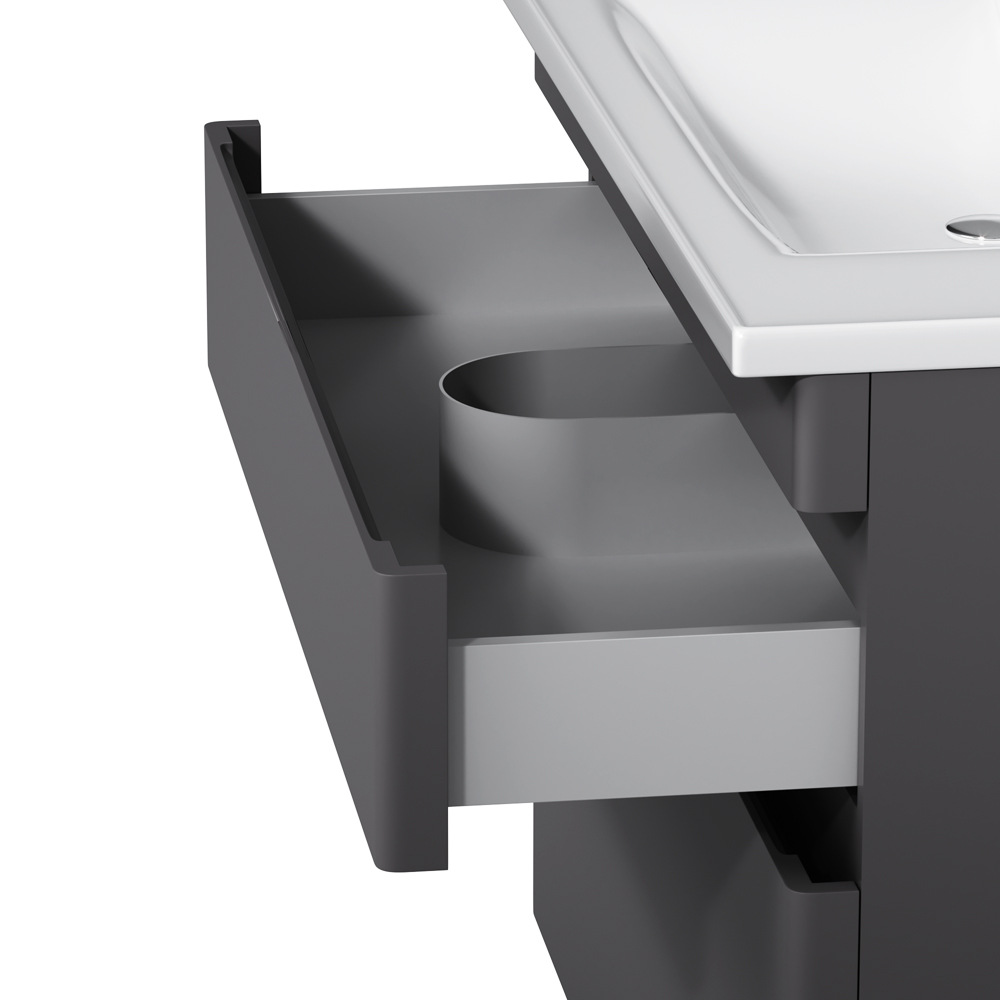 Новинка меблі для ванної Hit. Фасади в кольорі графіт покриті екологічно чистими і довговічними поліакриловими емалями, які наносяться за спеціальною технологією фарбування в 7 шарів. Це забезпечує насичений колір протягом усього терміну служби (від 10 років). М'яке відкриття і закриття ящиків забезпечують напрямні прихованого монтажу з системою м'якого закривання soft close. Тумба комплектується раковиною з склоподібного фарфору, самого гігієнічного і вологостійкого матеріалу. Це найкомпактніша і функціональна раковина на ринку: проекція всього 42 см при максимальній глибині чаші!