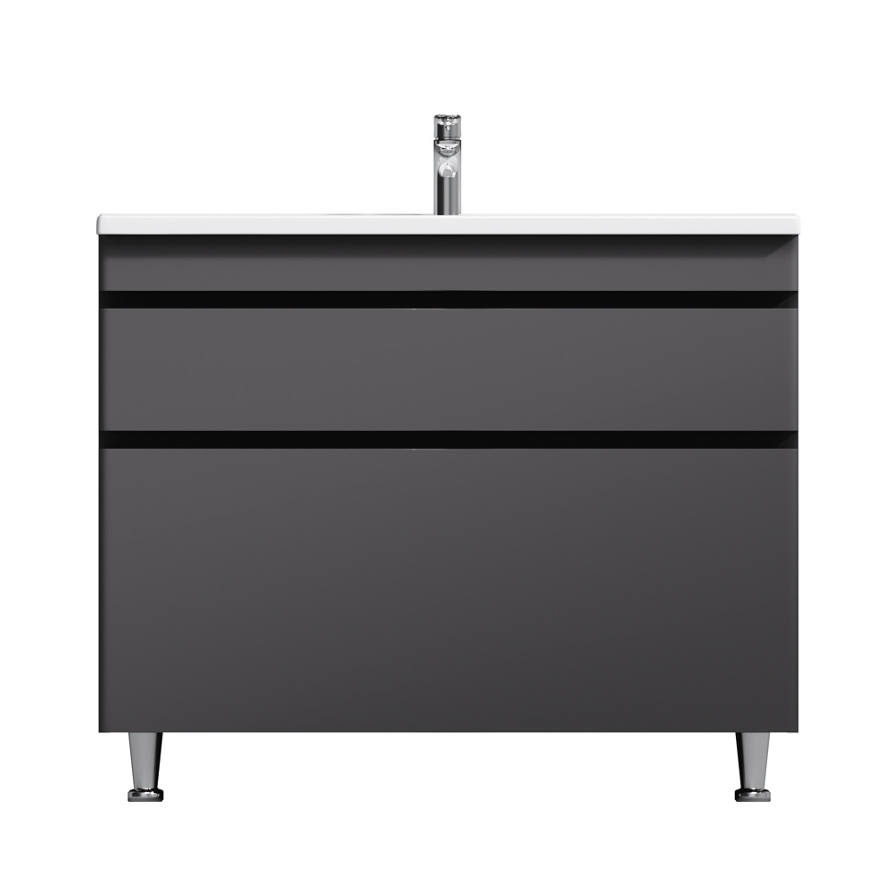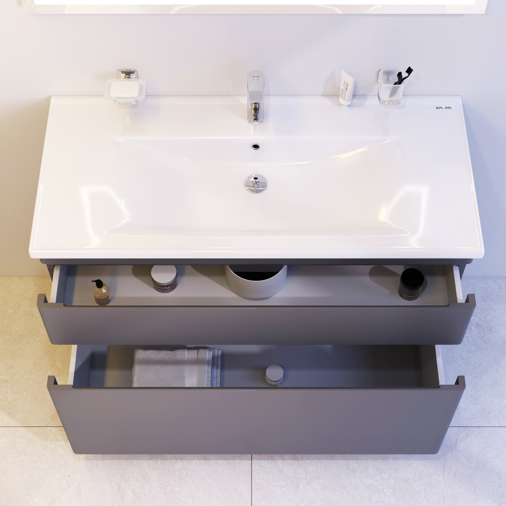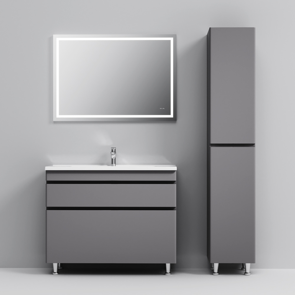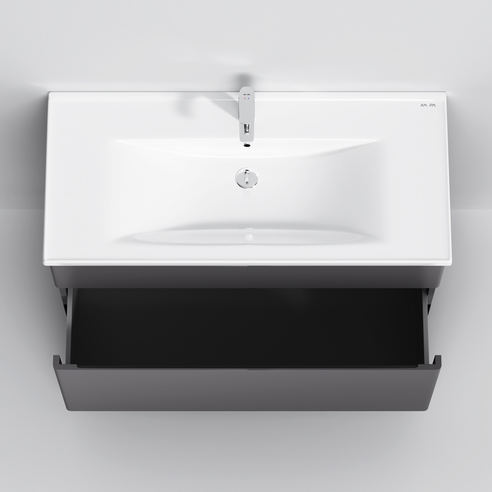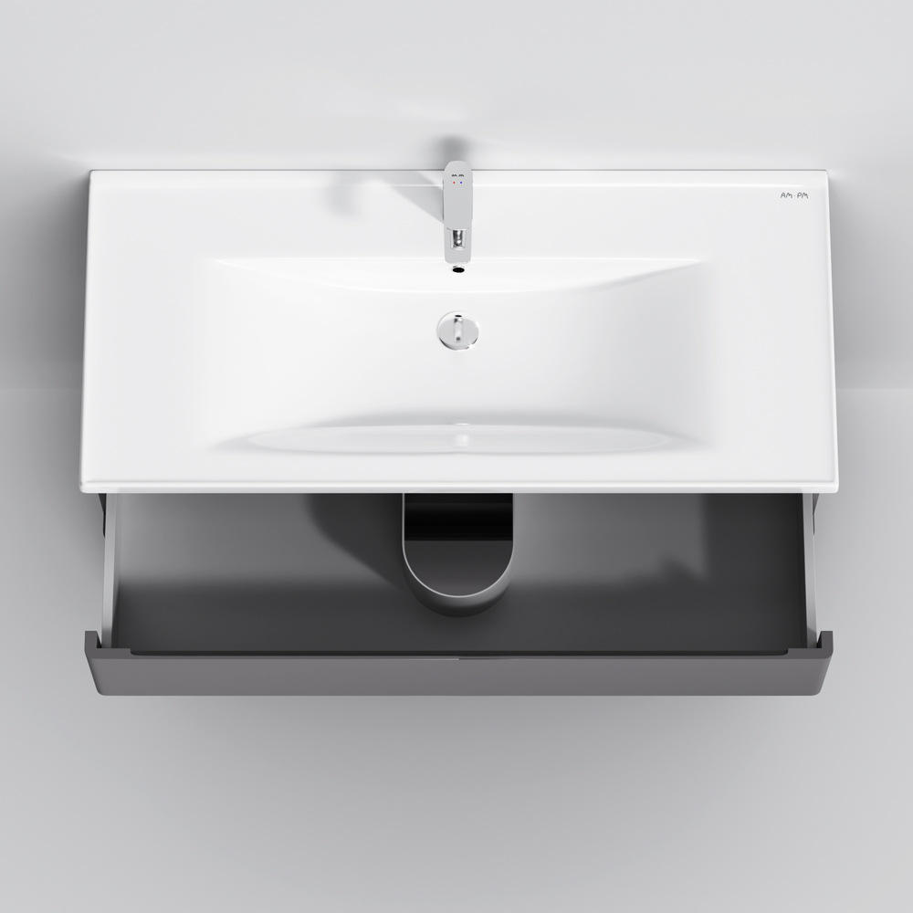 Новинка меблі для ванної Hit. Фасади в кольорі графіт покриті екологічно чистими і довговічними поліакриловими емалями, які наносяться за спеціальною технологією фарбування в 7 шарів. Це забезпечує насичений колір протягом усього терміну служби (від 10 років). М'яке відкриття і закриття ящиків забезпечують напрямні прихованого монтажу з системою м'якого закривання soft close. Тумба комплектується раковиною з склоподібного фарфору, самого гігієнічного і вологостійкого матеріалу. Це найкомпактніша і функціональна раковина на ринку: проекція всього 42 см при максимальній глибині чаші!
