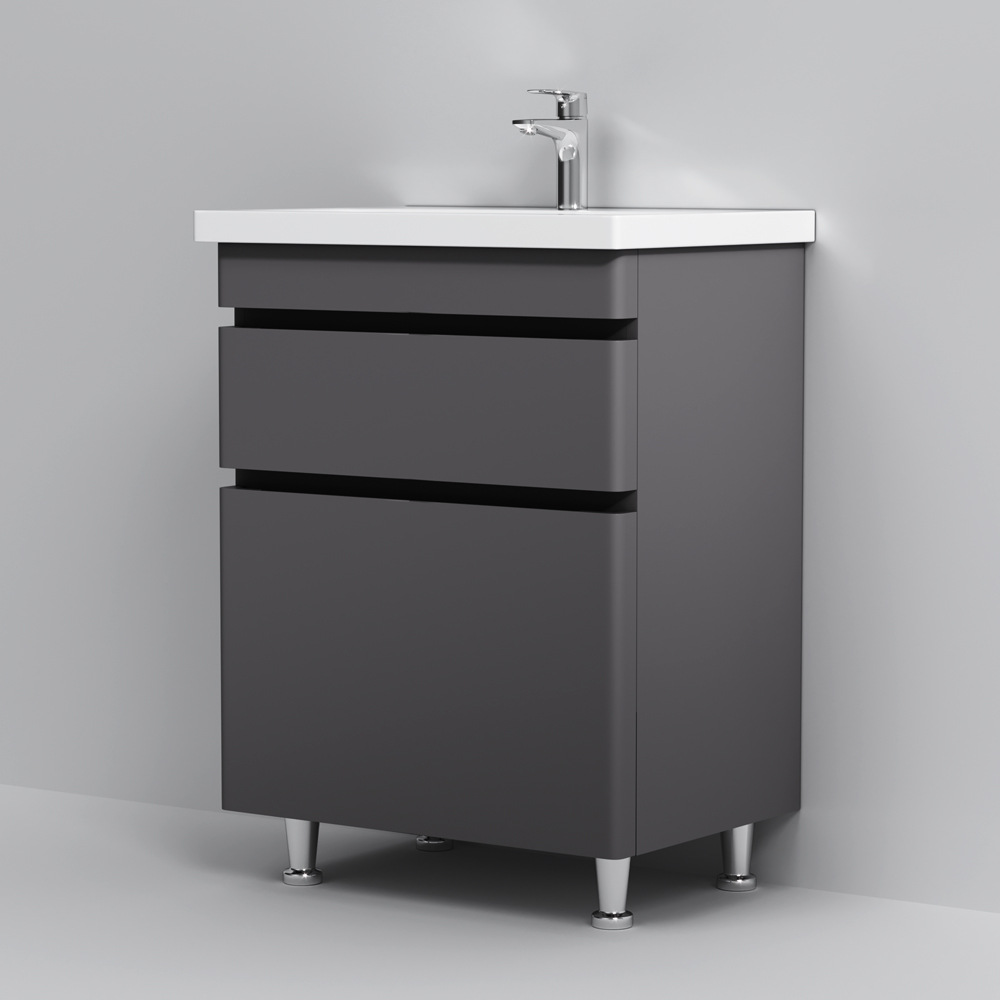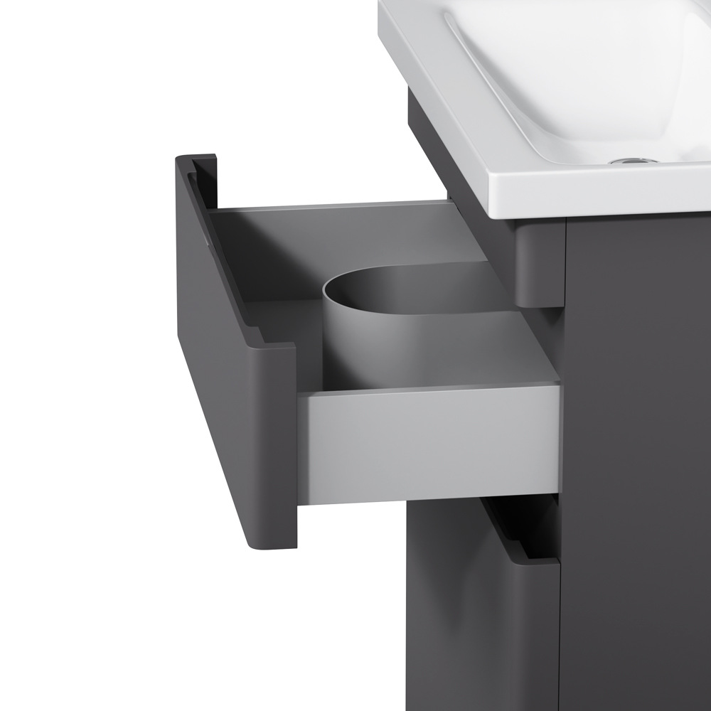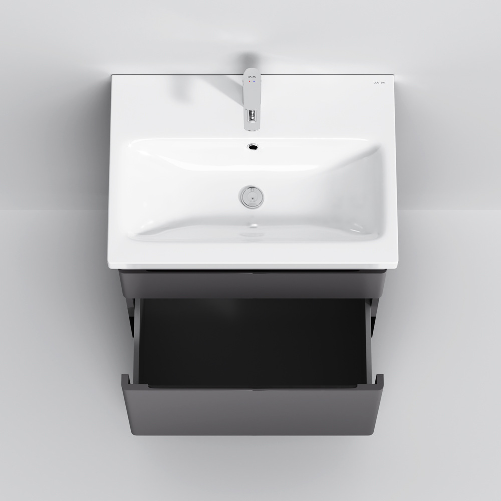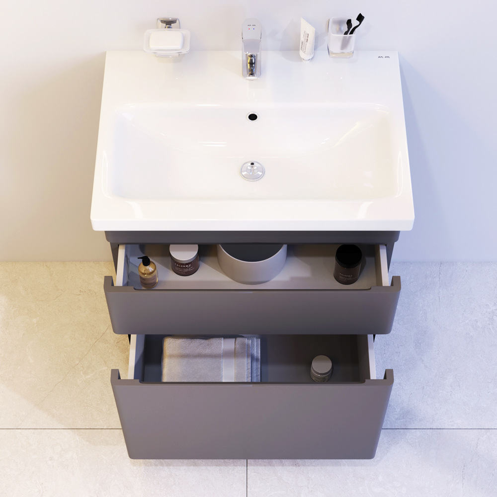 Новинка меблі для ванної Hit. Фасади в кольорі графіт покриті екологічно чистими і довговічними поліакриловими емалями, які наносяться за спеціальною технологією фарбування в 7 шарів. Це забезпечує насичений колір протягом усього терміну служби (від 10 років). М'яке відкриття і закриття ящиків забезпечують напрямні прихованого монтажу з системою м'якого закривання soft close. Тумба комплектується раковиною з склоподібного фарфору, самого гігієнічного і вологостійкого матеріалу. Це найкомпактніша і функціональна раковина на ринку: проекція всього 42 см при максимальній глибині чаші!