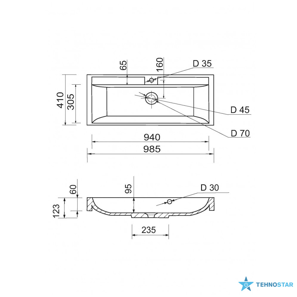 Раковина Adamant STRENG NEW пропонує накладний тип встановлення, прямокутну форму з отворами для змішувача та переливу.