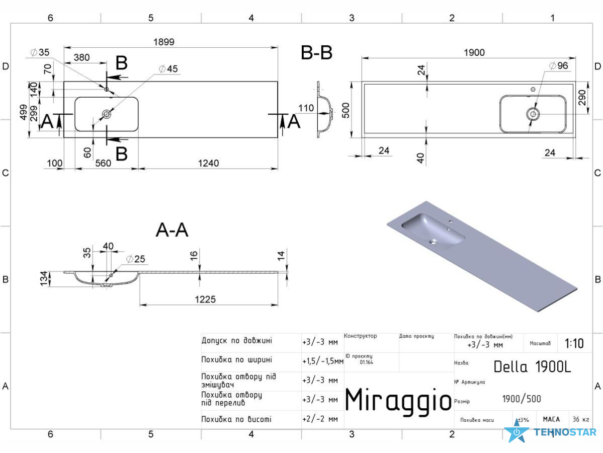 Умивальник DELLA 1900 L від бренду MIRAGGIO - це ідеальне рішення для санвузла будинку, готелю чи дачі.