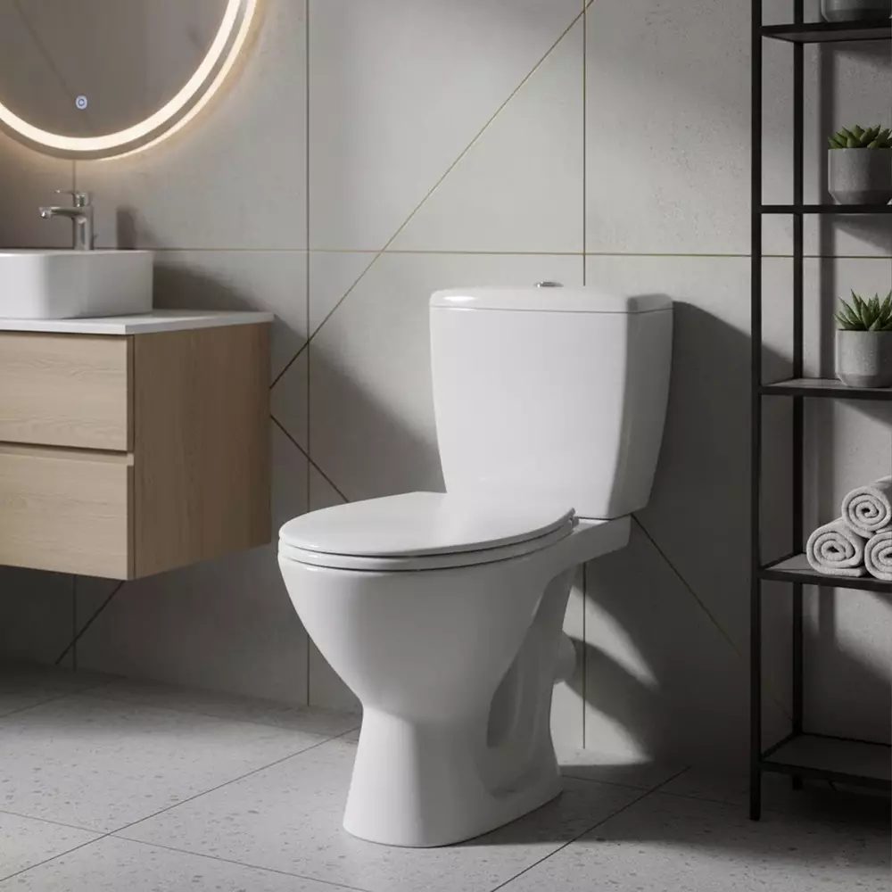 Унітаз оснащений бачком із двома режимами зливу — 3/6 літрів, що дозволяє економити воду та підтримувати гігієну. Конструкція передбачає горизонтальний випуск та боковий підвід води, що робить монтаж простим і сумісним зі стандартними системами.