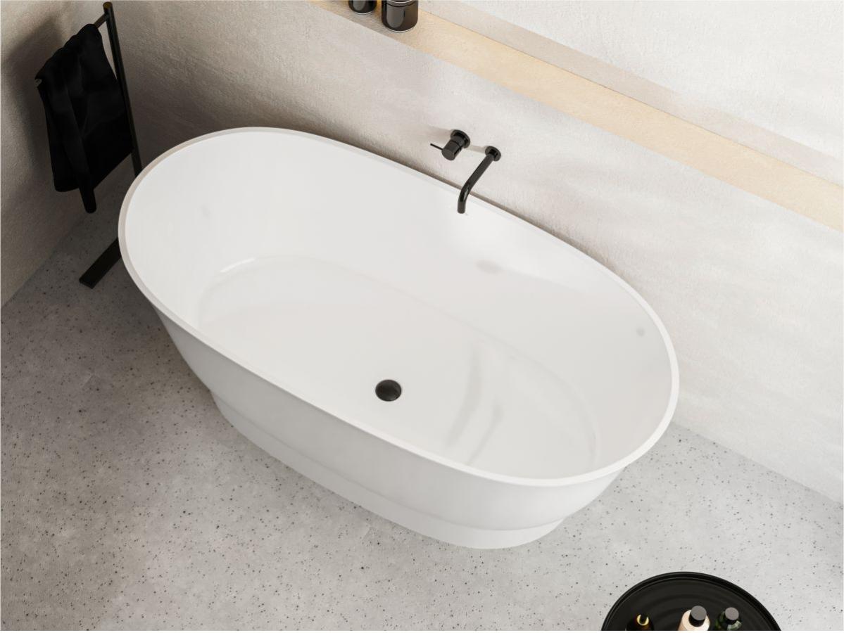 Miraggio MOLLY — окремо стояча ванна з литого мармуру з глянцевою поверхнею, створена як стильний акцент для сучасної ванної кімнати. Модель найкраще підходить для інтер’єрів у стилях modern, contemporary, minimal та spa, де важливі м’які форми й візуальна легкість. Овальна геометрія гармонійно поєднується з підлоговими змішувачами та стриманими оздоблювальними матеріалами, а компактні пропорції роблять ванну доречною навіть у ванних кімнатах середнього розміру.
