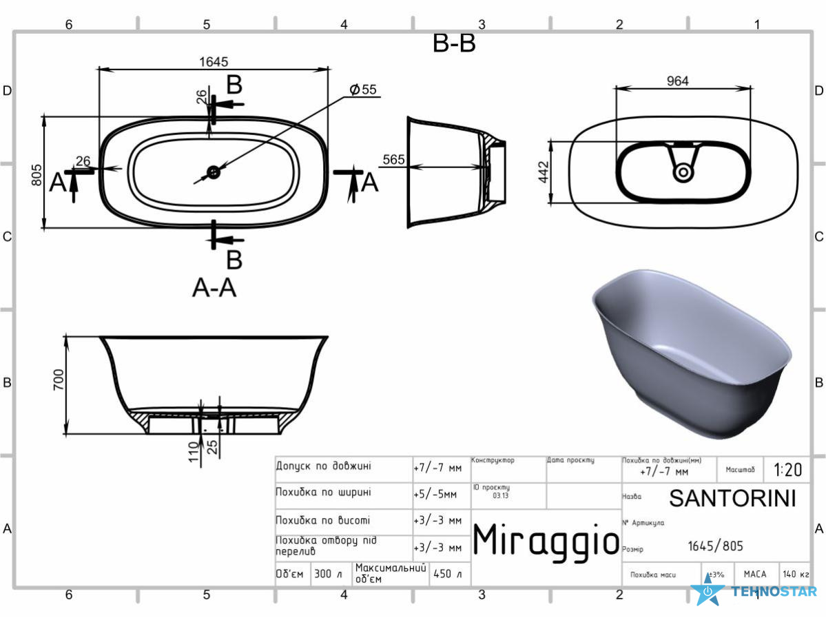 Ванна Miraggio SANTORINI MIRASOFT 0002409 — це преміум окремостояча ванна з матеріалу MIRASOFT, який забезпечує високу міцність, однорідну структуру та матову поверхню без мікропор. Вона має простору чашу (об’єм 450 л), габарити 1645×805×700 мм, що робить її комфортною для купання однієї або двох осіб.