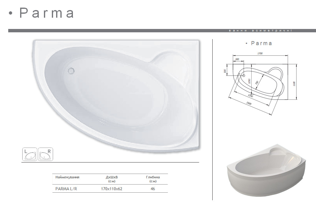 Акрилова ванна Redokss San PARMA 1700x1100 правостороння - зроблена з литого акрилу – це надійне та сучасне рішення для вашої ванної кімнати. Завдяки армованій конструкції, вона має суцільнолиту структуру, високу міцність, стійка до тріщин, подряпин та деформацій.