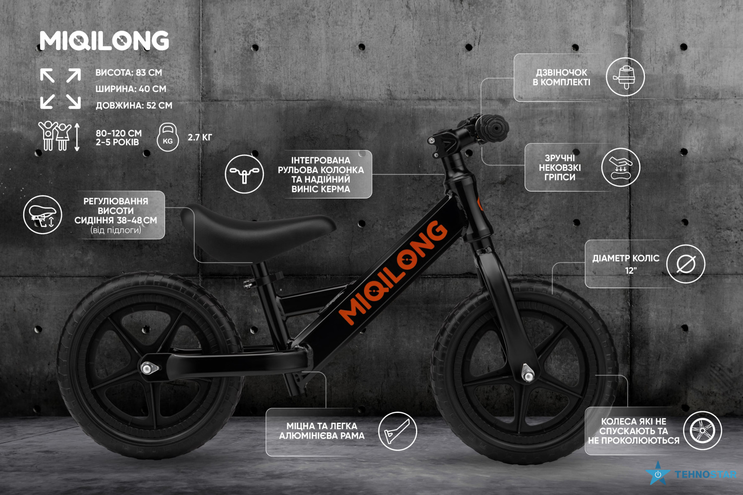 Miqilong ZCY-HP12-BLACK вирізняється сучасним дизайном у чорному кольорі, який підходить як хлопчикам, так і дівчаткам. Модель поєднує компактність, простоту використання та надійність, роблячи її оптимальним вибором для активних прогулянок і розвитку навичок балансу з раннього віку.
