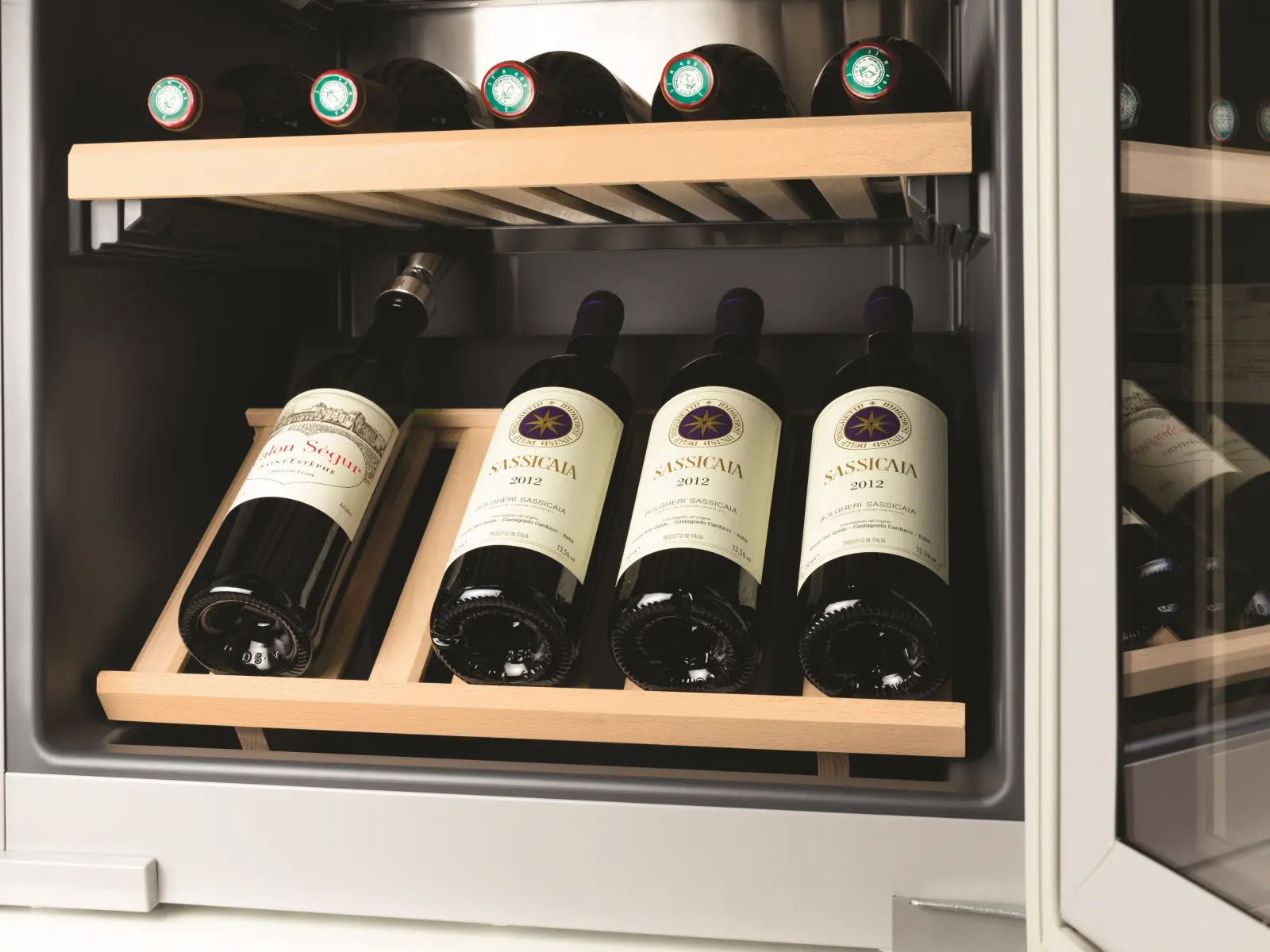 Візуально шафа органічно вписується в різні стилі інтер’єру від мінімалізму до сучасної класики. Тоноване скло дверцят і натуральні дерев’яні полиці створюють естетику природної гармонії, тоді як чіткі геометричні лінії та можливість інтегрувати шафу під меблевий фасад надають вашій кухні відчуття простору й порядку. У контексті дизайну вона не лише зберігає колекцію вин, а й стає стильним фокусом у зоні дегустації, що підкреслює смак власника — як у виборі вина, так і в підході до облаштування дому.