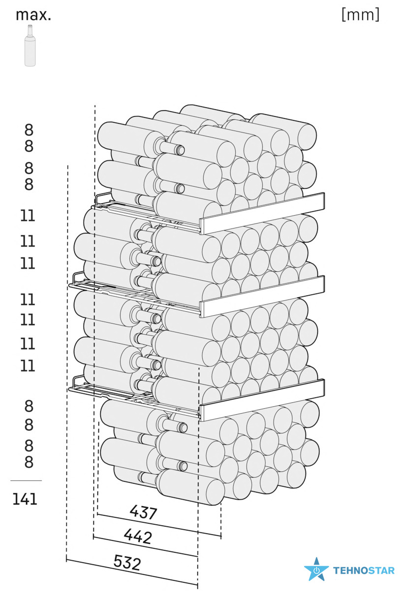 Внутрішній простір вирізняється продуманим дизайном: дерев’яні полиці з бука регулюються за висотою, підтримують правильний мікроклімат і мінімізують вібрації. Для максимальної місткості передбачено можливість розташування пляшок шийками одна до одної. Панель задньої стінки з графітово‑сірого металу додає стильного вигляду та сприяє рівномірній циркуляції повітря. Зовнішній вигляд доповнює тонка чорна ручка, яка поєднує ергономіку та естетику.