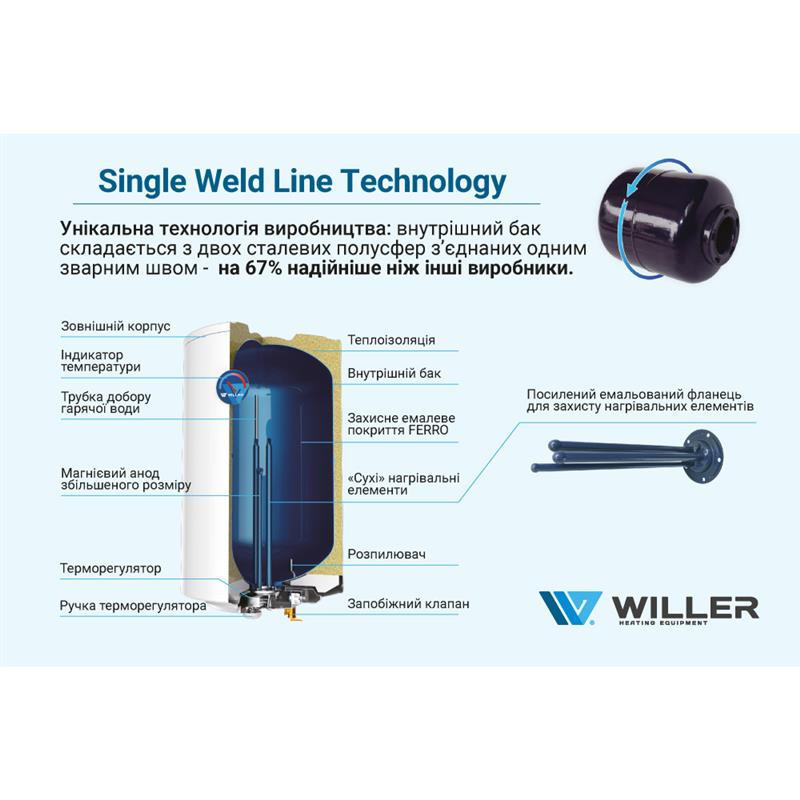 Willer EV30DR Optima - надійний накопичувальний електричний бойлер циліндричної форми об'ємом 30 літрів. Унікальна технологія виробництва: внутрішній бак бойлера складається з двох півсфер, з'єднаних одним зварним швом - ймовірність протікання на 67% менше ніж у інших виробників. Оснащений двома захищеними (сухими) нагрівальними елементами загальною потужністю 1,5 кВт. ТЕНи захищені від води спеціальним кожухом з емальованим покриттям, що дозволяє продовжити термін служби нагрівальних елементів і бойлера. Внутрішній бак, виготовлений зі сталі, покритої титанокварцевою емаллю, і захисний магнієвий анод забезпечують тривалий термін експлуатації.