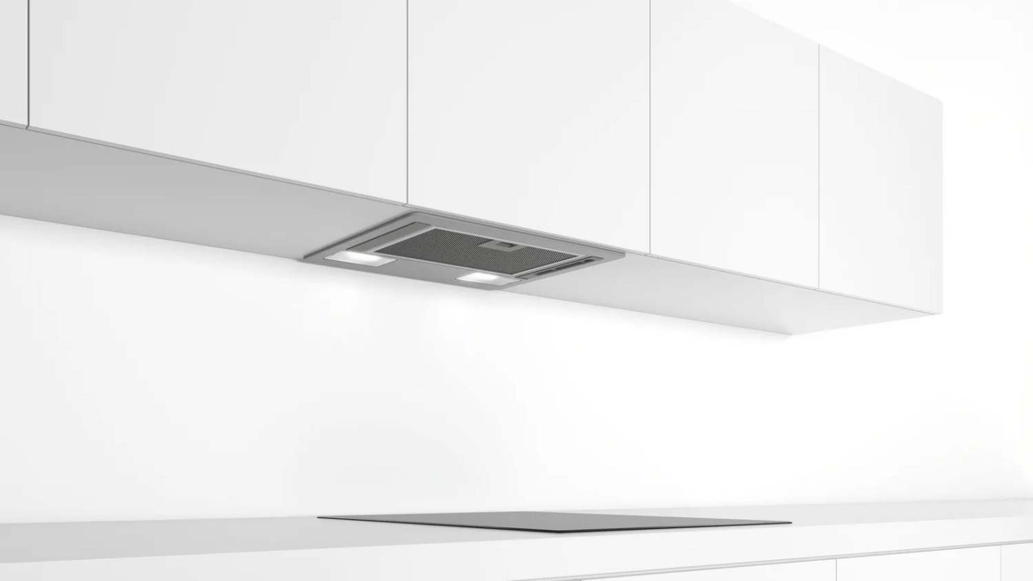 Вбудована витяжка Bosch DLN53AA70 працює у режимах відведення та рециркуляції, для останнього потрібен окремий комплект. Повзунковий перемикач дозволяє обирати 3 рівні потужності та керувати освітленням, а металевий жиропоглинаючий фільтр придатний для миття в посудомийній машині. Для запобігання зворотній тязі передбачено зворотний клапан.