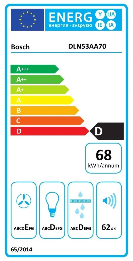 Bosch DLN53AA70 — компактна вбудована витяжка з продуктивністю до 302 м³/год за DIN/EN 61591 та трьома рівнями потужності з повзунковим керуванням. Підтримує роботу в режимі відведення та рециркуляції повітря, для рециркуляції потрібен відповідний комплект. Оснащена зворотним клапаном і приєднувальним патрубком Ø120 мм для стандартного монтажу. Багатошарові металеві жирові фільтри легко знімати і можна мити в посудомийній машині, регулярне очищення підтримує стабільну ефективність. Тепле LED-освітлення з колірною температурою 2700 K економно підсвічує робочу зону. Рівень шуму становить 46–62 дБ(A), середнє річне споживання енергії — 67,7 кВт·год, клас енергоефективності — D.
