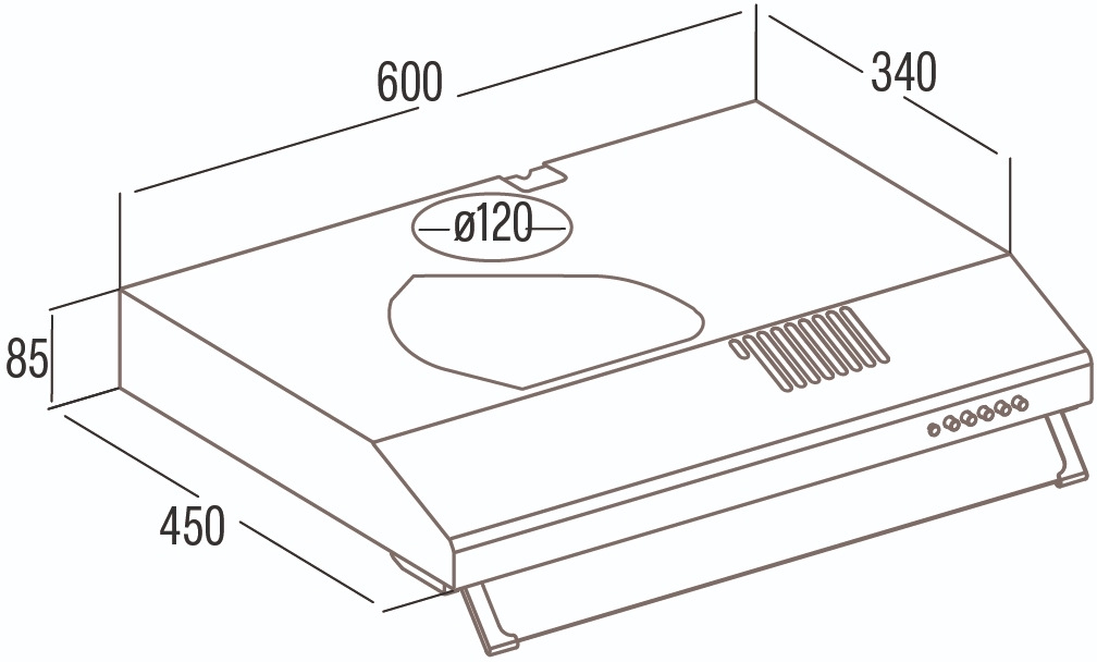 LED-освітлення економно підсвічує робочу зону. Витяжка працює в режимі відведення або рециркуляції (з вугільним фільтром, який купується окремо). Діаметр виходу 120 мм, мінімальна відстань до плити 650 мм. Клас енергоефективності B, низьке споживання енергії.
