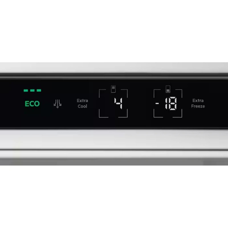 Вбудований холодильник Electrolux LNG7TE18S з нижньою морозильною камерою оснащений розсувним кріпленням фасаду для повної інтеграції. Корисний об'єм становить 253 л (192 л холодильна камера та 61 л морозильна). Технологія TwinTech No Frost забезпечує роздільне охолодження камер без утворення інею в морозильнику. Ящик GreenZone зберігає вітаміни в овочах та фруктах завдяки контролю вологості. Інверторний компресор характеризується тихою роботою, функції Action Cool та Action Freeze підтримують швидке охолодження та заморожування.