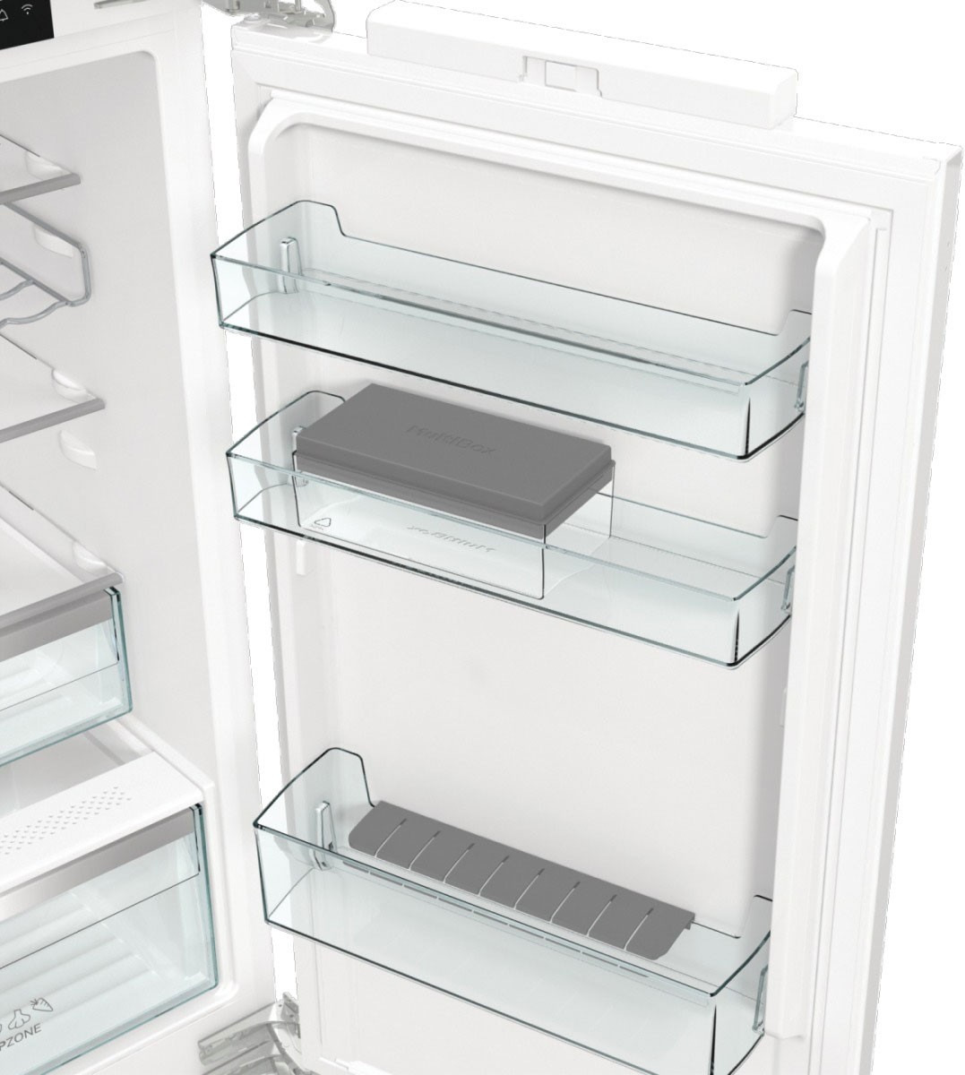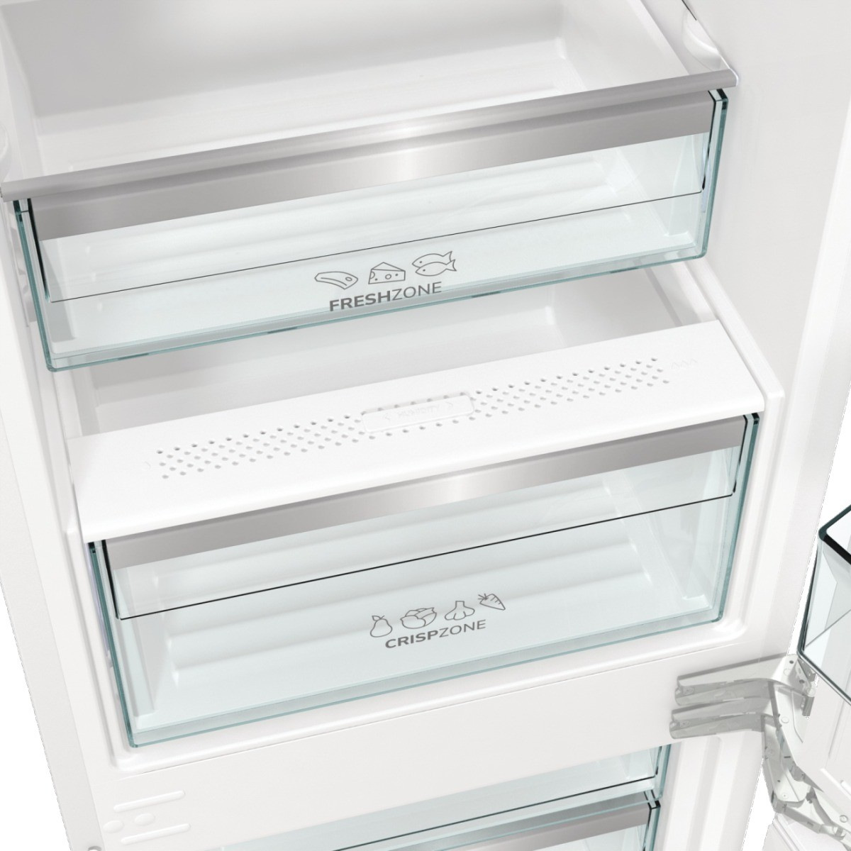 Gorenje NRKI517E82WF — вбудований холодильник із нижнім морозильним відділенням, розрахований на інтеграцію в кухонний гарнітур із жорстким кріпленням фасадів та шарнірами SoftClose. Конструкція дозволяє перенавішування дверцят, що спрощує планування кухонного простору.