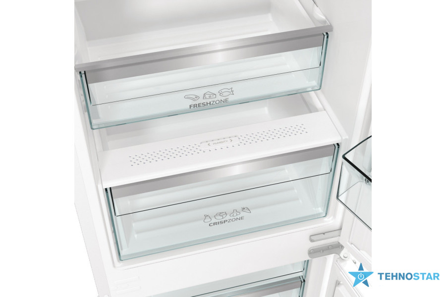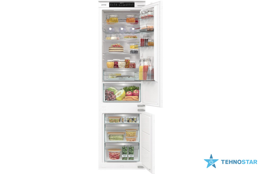 Gorenje NRKI519D61WF — вбудований двокамерний холодильник серії G600 з комбінованою морозильною камерою внизу. Пристрій позиціонується як інтегрований вбудований агрегат з білими дверцями та сталевими елементами.