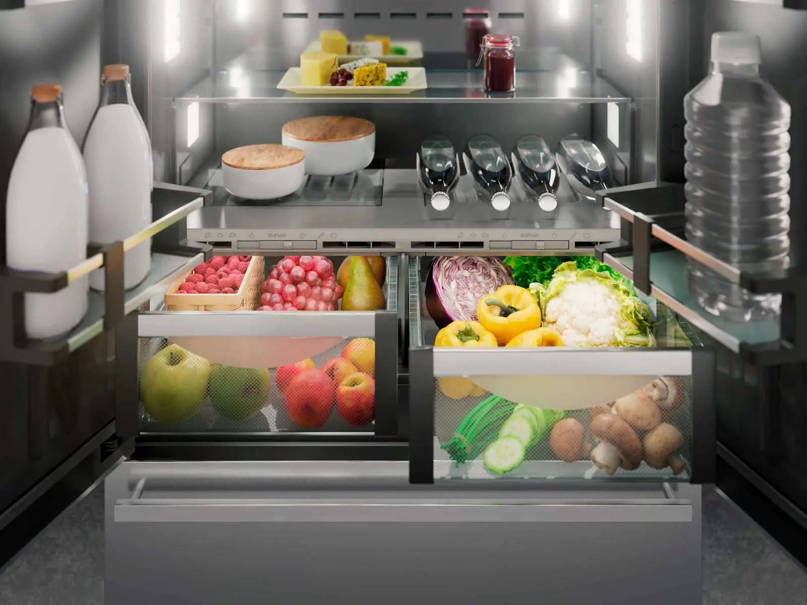 У контейнерах BioFresh навіть чутливі продукти, що потребують делікатного відношення, залишаються свіжими протягом тривалого часу. Завдяки температурі, близької до 0 °C, у контейнерах «Meat & Dairy» створені ідеальні умови для зберігання м’яса або свіжого молока. Контейнери «Fruit & Vegetable» мають підвищену вологість завдяки щільному закриттю – ідеальні умови для фруктів та овочів. І найкраще: все вже оптимально налаштовано на заводі-виробнику.