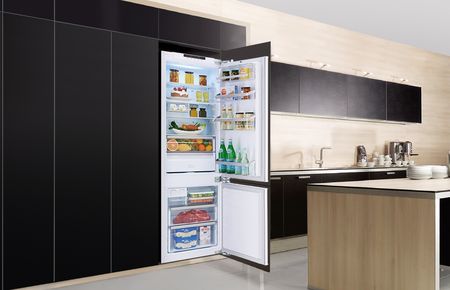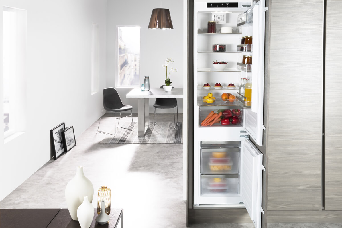 Повна інтеграція — дверцята холодильника монтуються врівень із кухонними фасадами для естетичного вигляду.