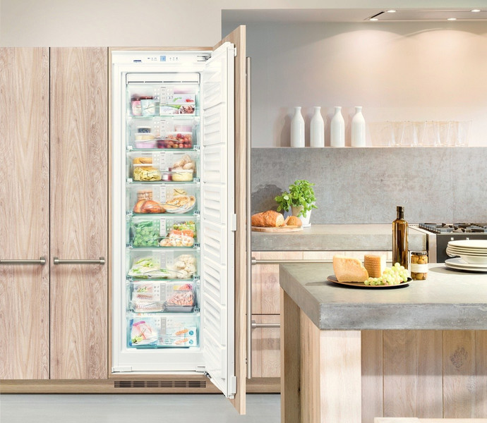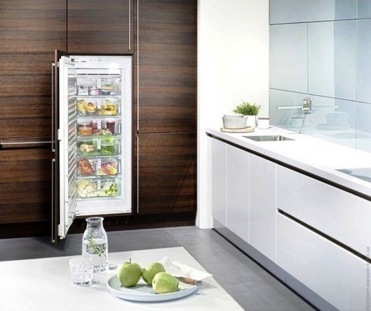 Встроенная морозильная камера – функциональный компактный элемент технического оснащения кухни. Ее можно использовать как дополнительный объем для хранения замороженных продуктов, например, летних фруктов и овощей. Он подойдет для оснащения помещений, в которых, из-за небольших размеров или особенностей конфигурации сложно расположить полноценный холодильник.