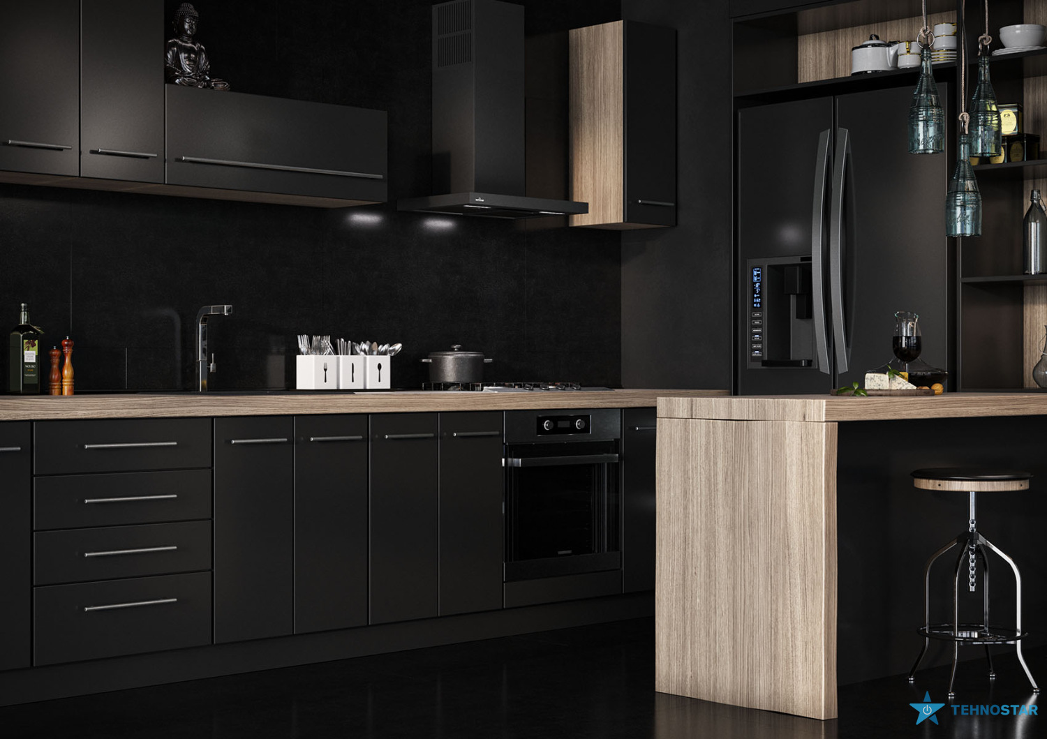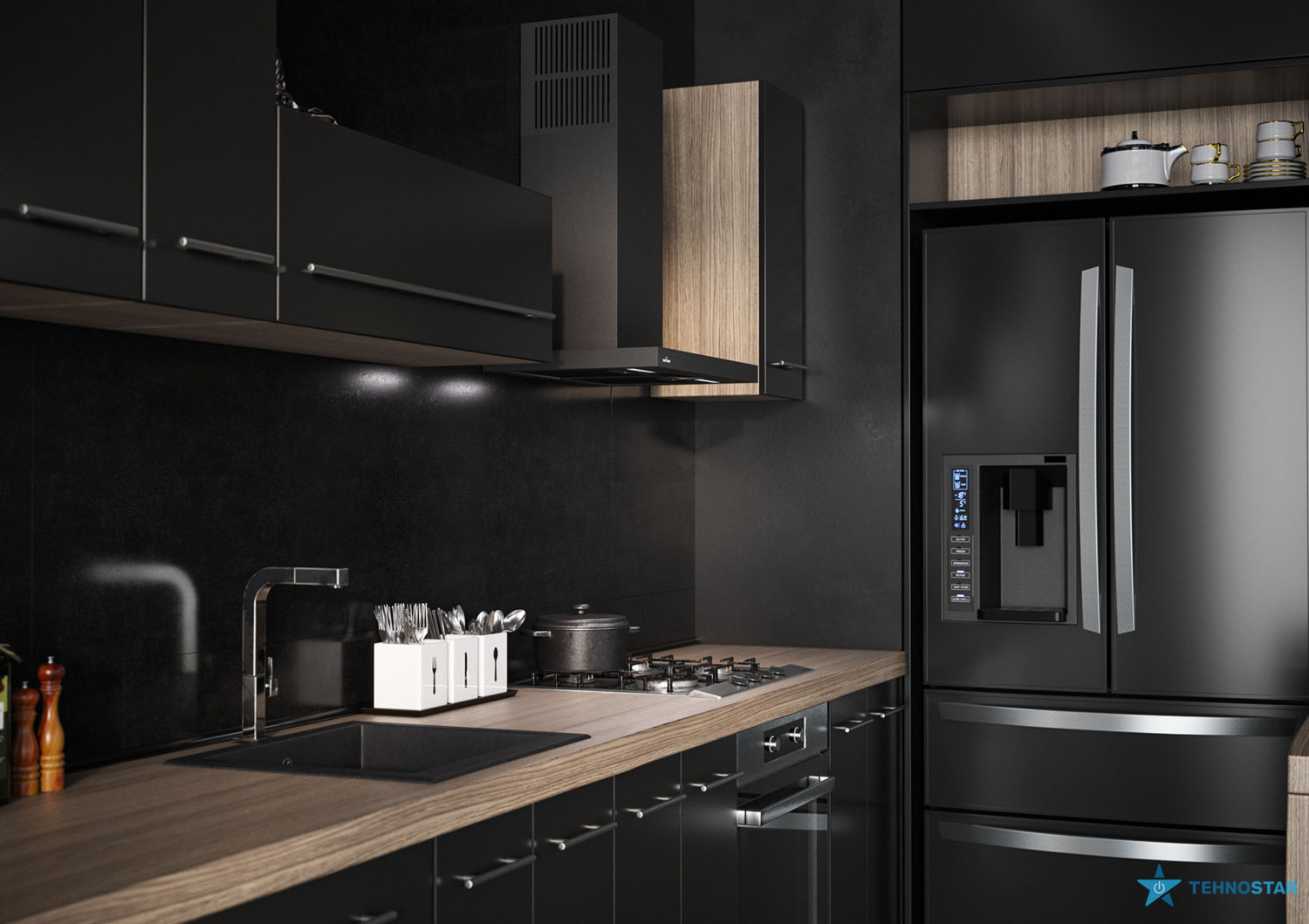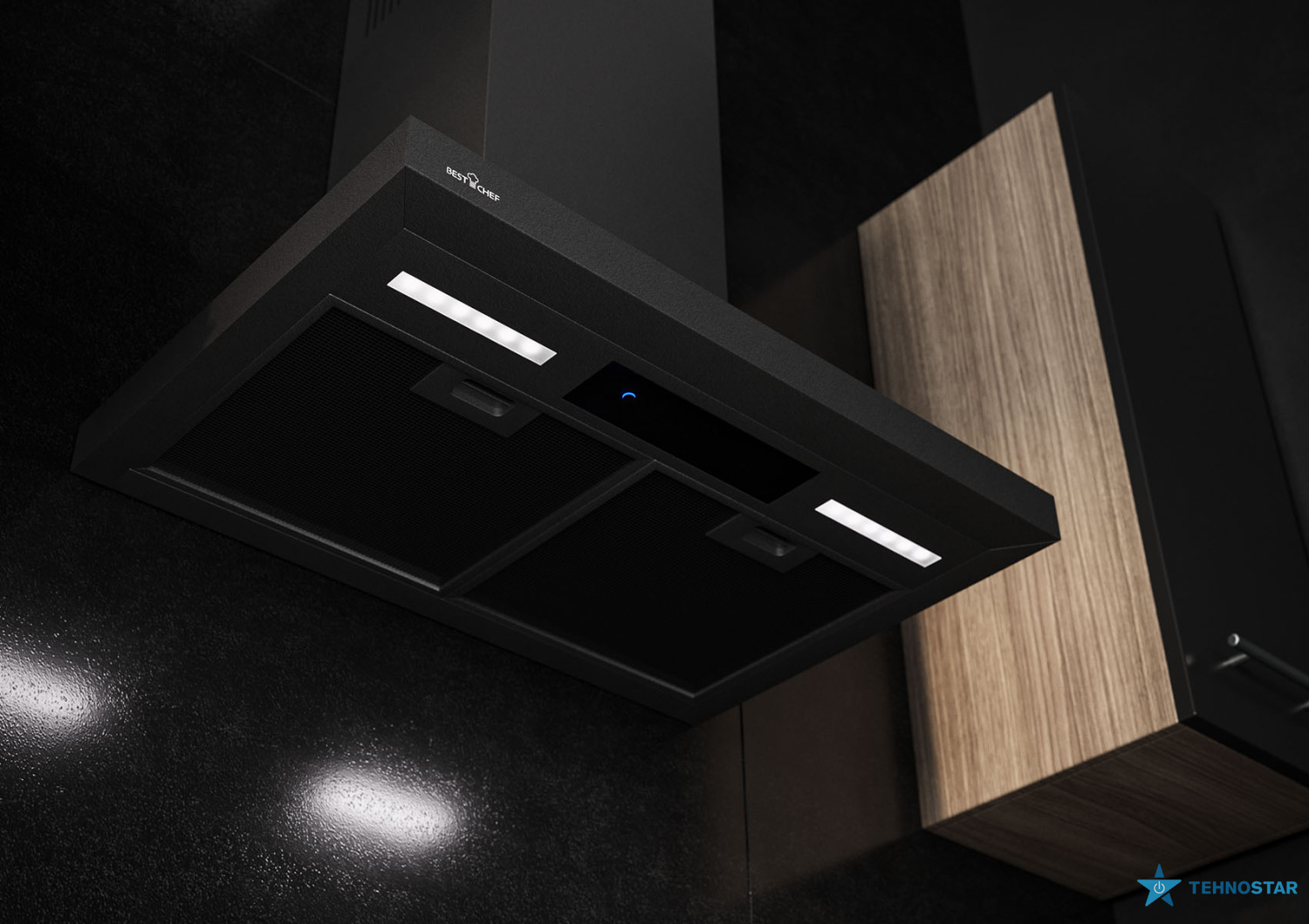Її Т-подібна форма не лише додає естетики, а й забезпечує зручність у використанні, дозволяючи зменшити відстань між плитою та витяжкою, що покращує ефективність відведення повітря. Витяжка монтується до стіни, що робить її ідеальним вибором для кухонь з обмеженим простором.