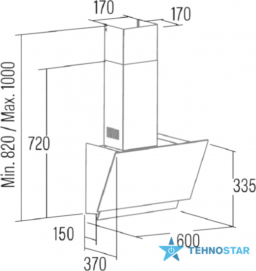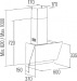 Витяжка має стильний дизайн у чорному склі з шириною 600 мм, що робить її вдалою для сучасної кухні. Мінімальна відстань до електричної варильної поверхні повинна становити 400 мм, а до газової — 650 мм.