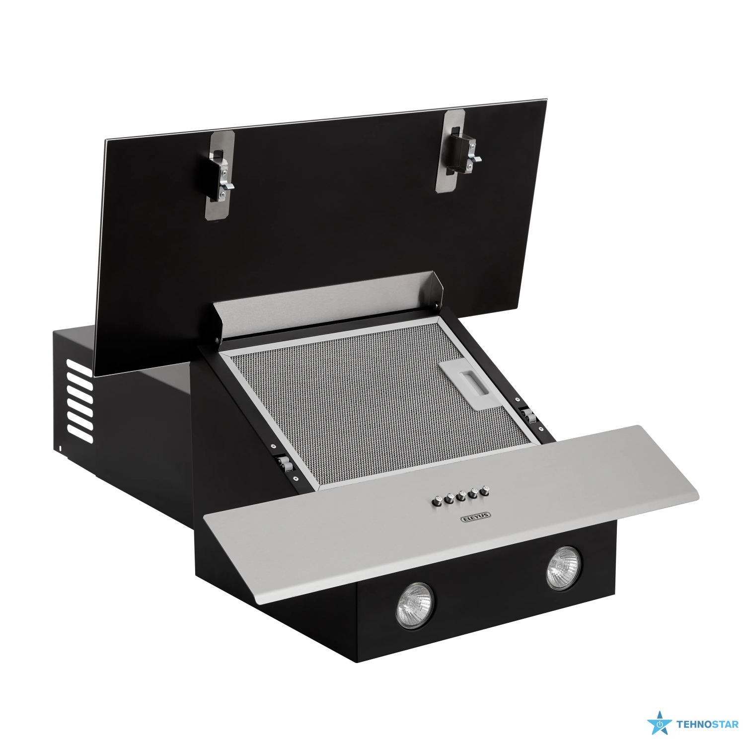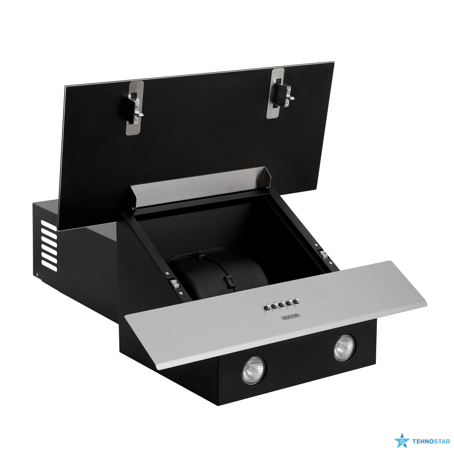 Витяжка виконана в елегантному чорному кольорі з трьохстороннім фасадом із закаленого скла, що надає їй сучасного вигляду та полегшує догляд. Металевий корпус покритий порошковою фарбою, що забезпечує захист від корозії та підвищеної температури. Її стильний дизайн гармонійно впишеться в інтер'єр кухонь у стилі хай-тек, модерн або мінімалізм.