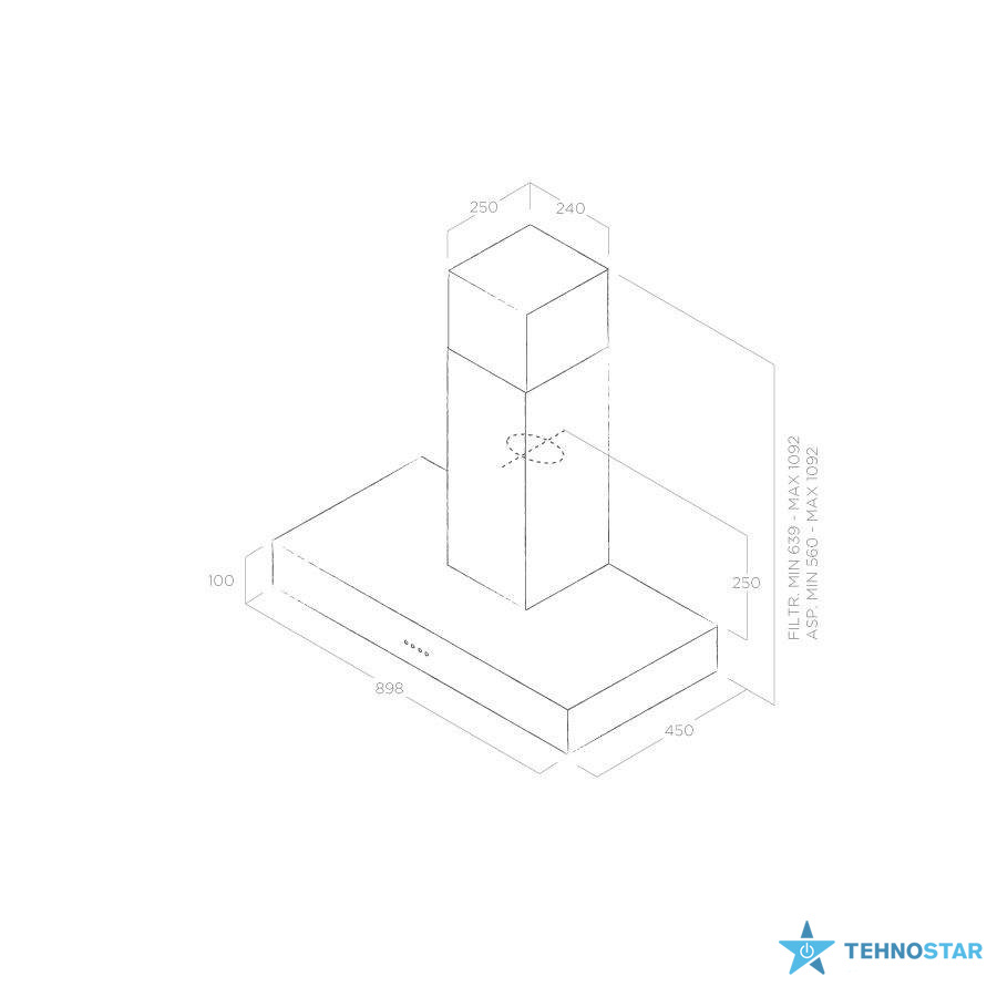 У технічному плані це настінна витяжка, спроектована для монтажу біля робочої зони; її форма оптимізована для ефективного захоплення пари й запахів саме в зоні плити. Продумана аеродинаміка корпусу та надійний мотор забезпечують стабільну роботу під час інтенсивного приготування, а можливість роботи в режимі відведення або рециркуляції дає гнучкість при підключенні до вентиляції.