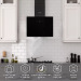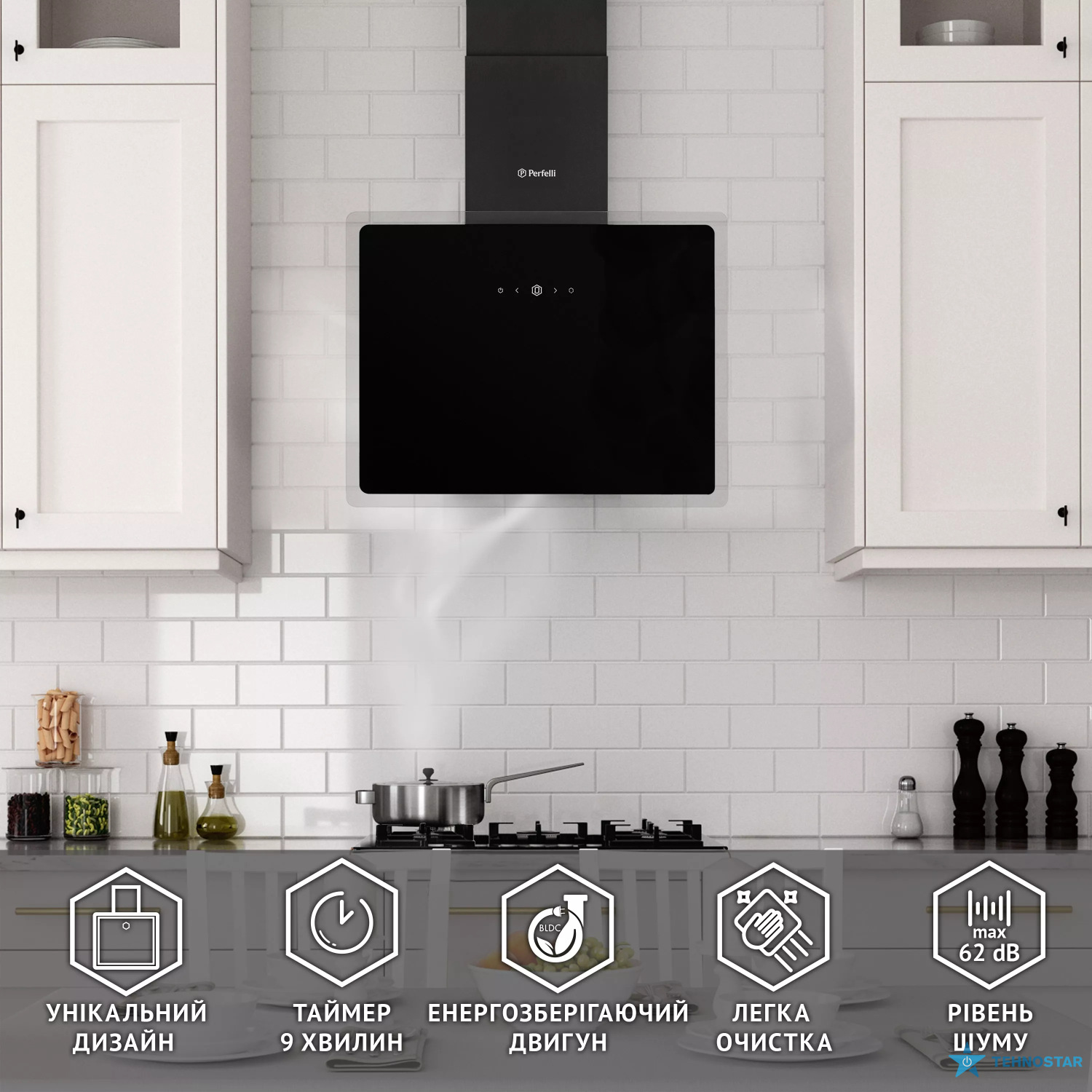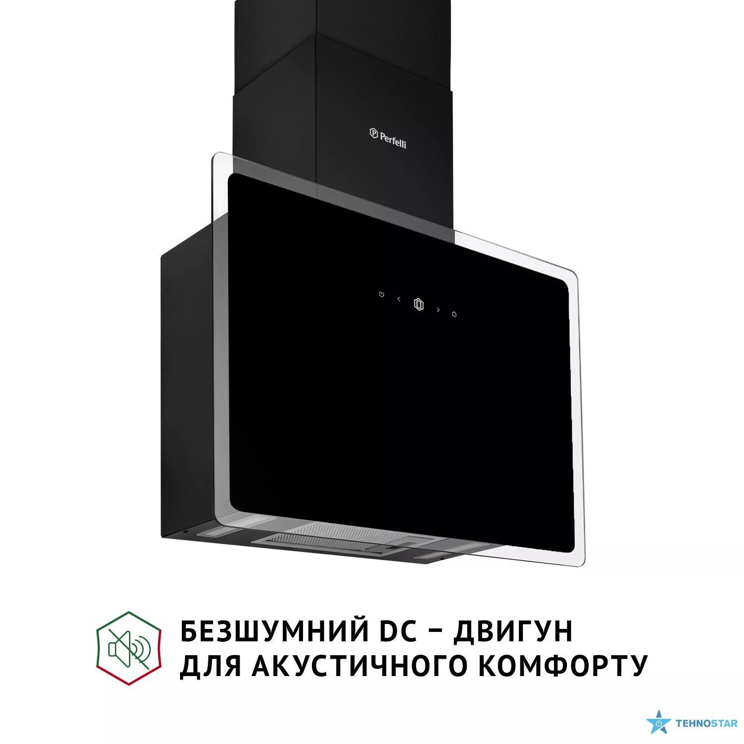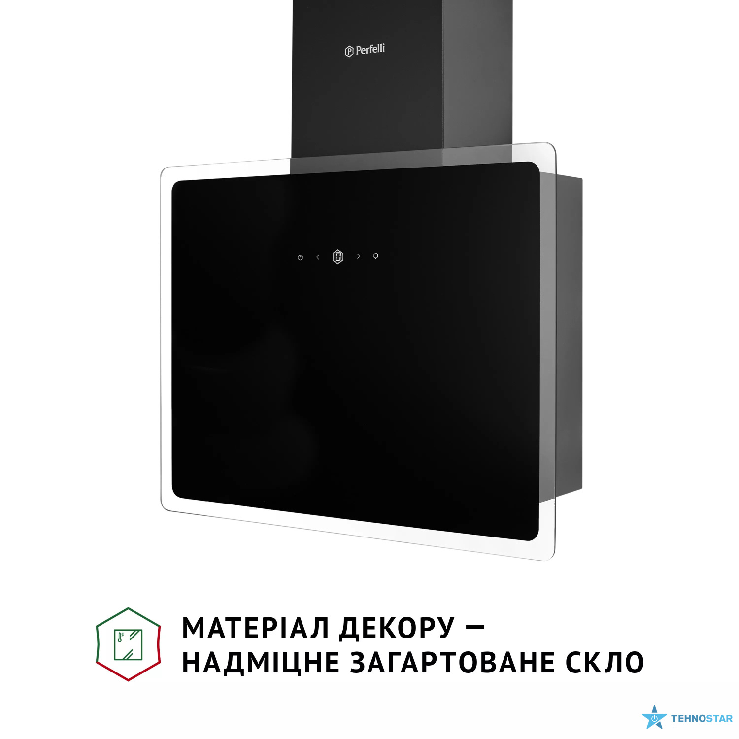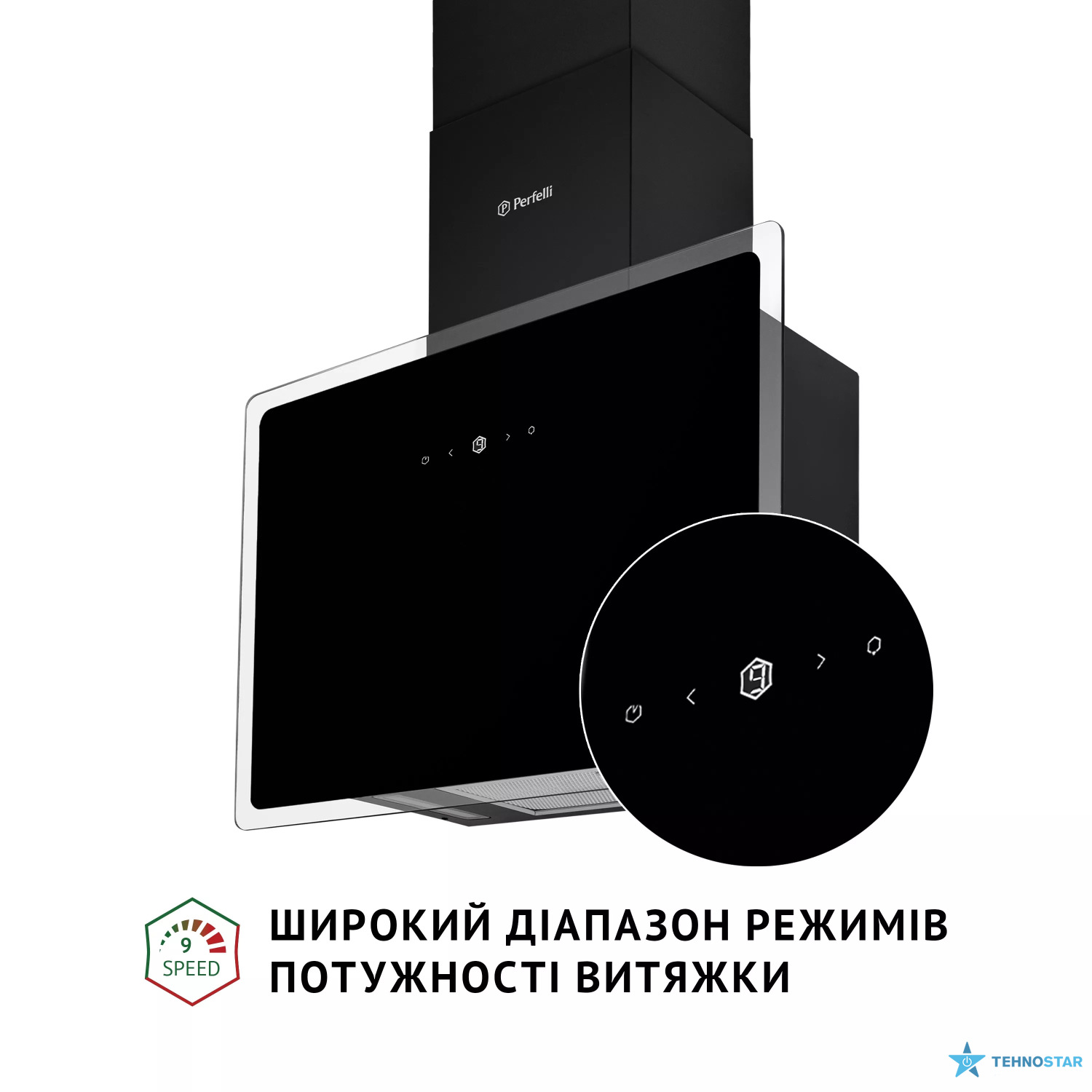 Perfelli RIVA NERO — декоративна витяжка вирізняється сучасним похилим дизайном у чорному кольорі, що додає кухні стильного акценту та гармонійно поєднується з іншою технікою. Її конструкція передбачає настінний монтаж, завдяки чому вона стає не лише функціональним елементом, а й частиною інтер’єру, підкреслюючи індивідуальність простору.