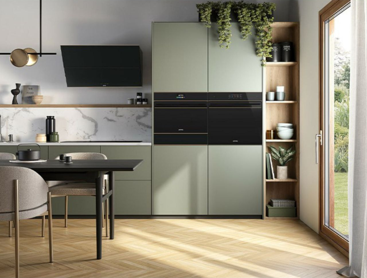 Вертикальна витяжка висотою 90 см в естетиці Dolce Stil Novo оснащена зменшеною глибиною, що забезпечує максимальну свободу пересування на кухні. Завдяки елегантній чорній скляній поверхні з вкрапленнями мідних вставок та сенсорному управлінню з підсвічуванням він ідеально поєднується з іншими приладами в естетиці Dolce Stil Novo.