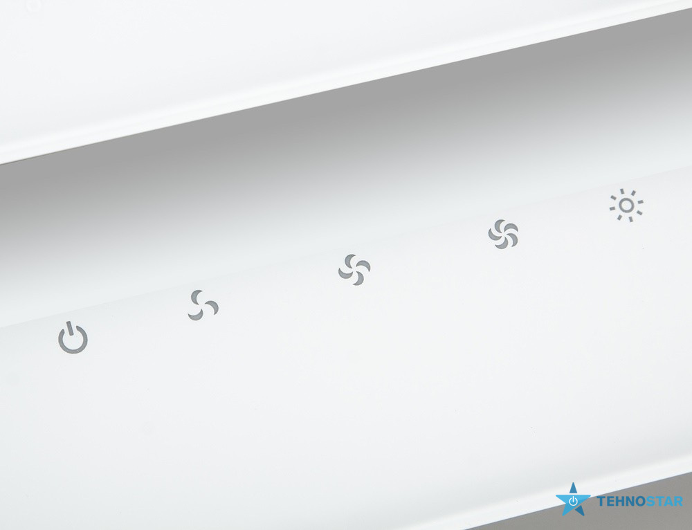 Управління витяжкою здійснюється за допомогою сенсорної панелі з можливістю керування жестами, що додає зручності та сучасного вигляду. Витяжка оснащена двома світлодіодними лампами по 1,5 Вт кожна, що забезпечують яскраве та енергоефективне освітлення робочої поверхні.