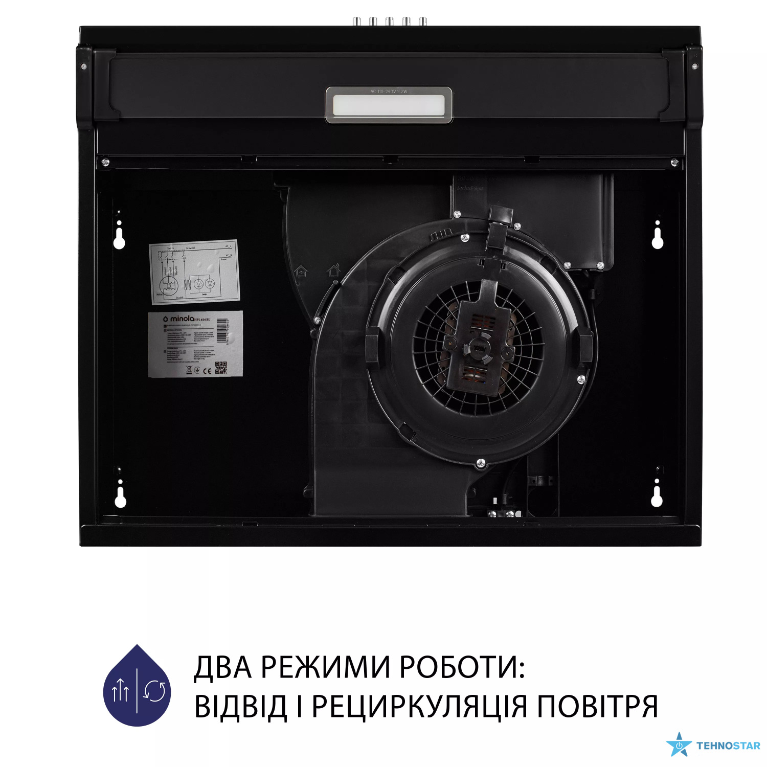 Витяжка працює в двох режимах: відведення повітря та рециркуляція. У разі відсутності можливості підключення до вентиляції, можна використовувати рециркуляцію з додатковим вугільним фільтром, що забезпечує ефективне очищення повітря від запахів та жирних часточок.