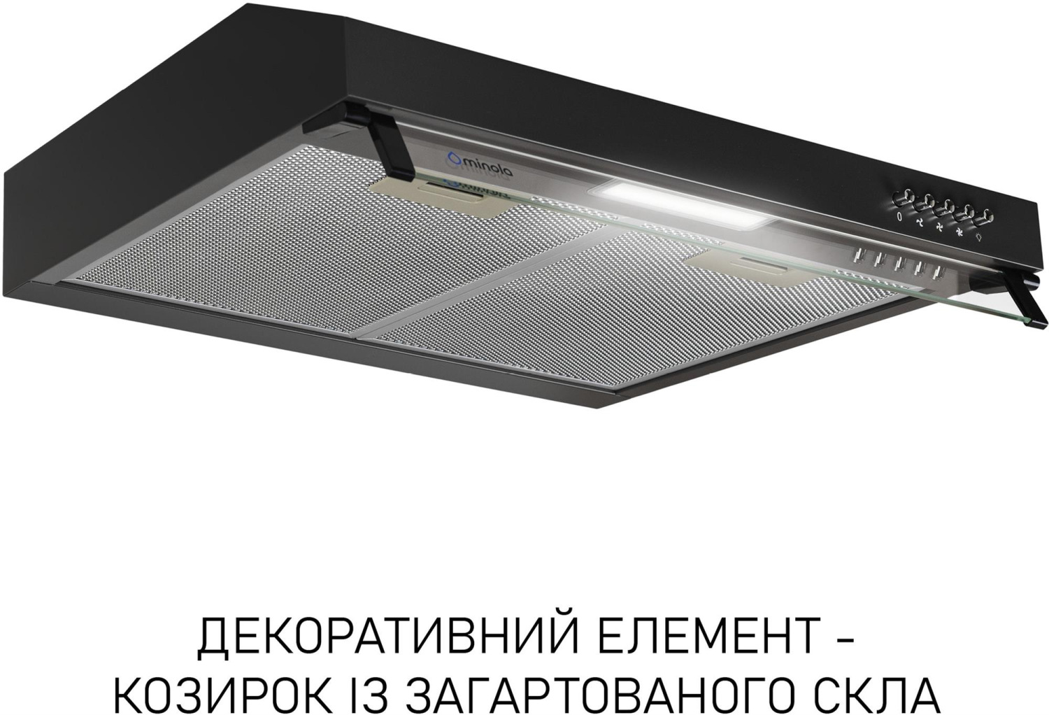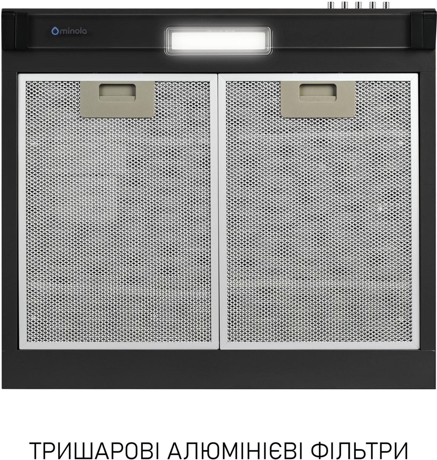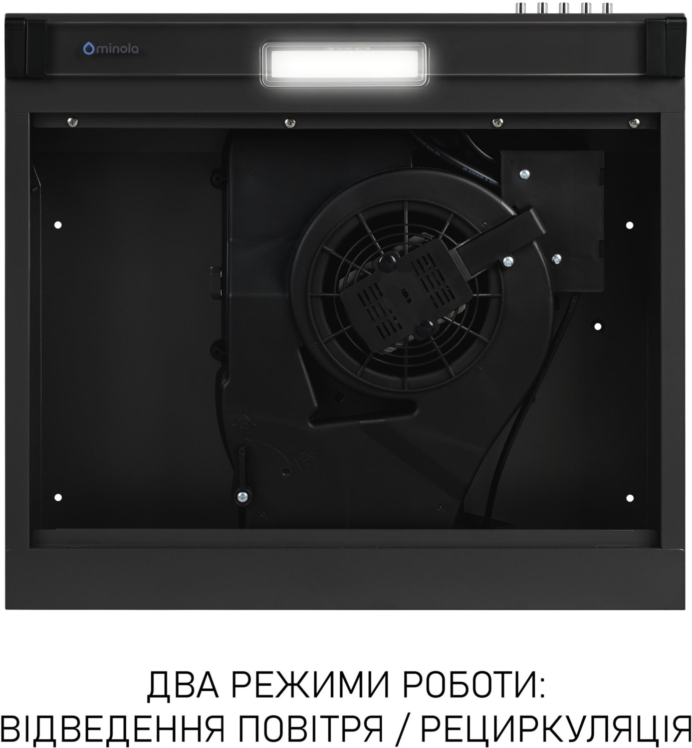 Minola HPL 522 BL — це стильна та компактна плоска витяжка, яка поєднує потужність і витонченість. Скляний козирок та глибокий чорний колір роблять її елегантним акцентом у будь-якому інтер’єрі, а продуктивність 450 м2/год дозволяє підтримувати чистоту повітря навіть на кухнях до 15 м2. Модель вирізняється зручним механічним керуванням, LED-підсвіткою та можливістю роботи в режимах відведення і рециркуляції. Вона створена для тих, хто цінує простоту, якість і стиль у кожній деталі.
