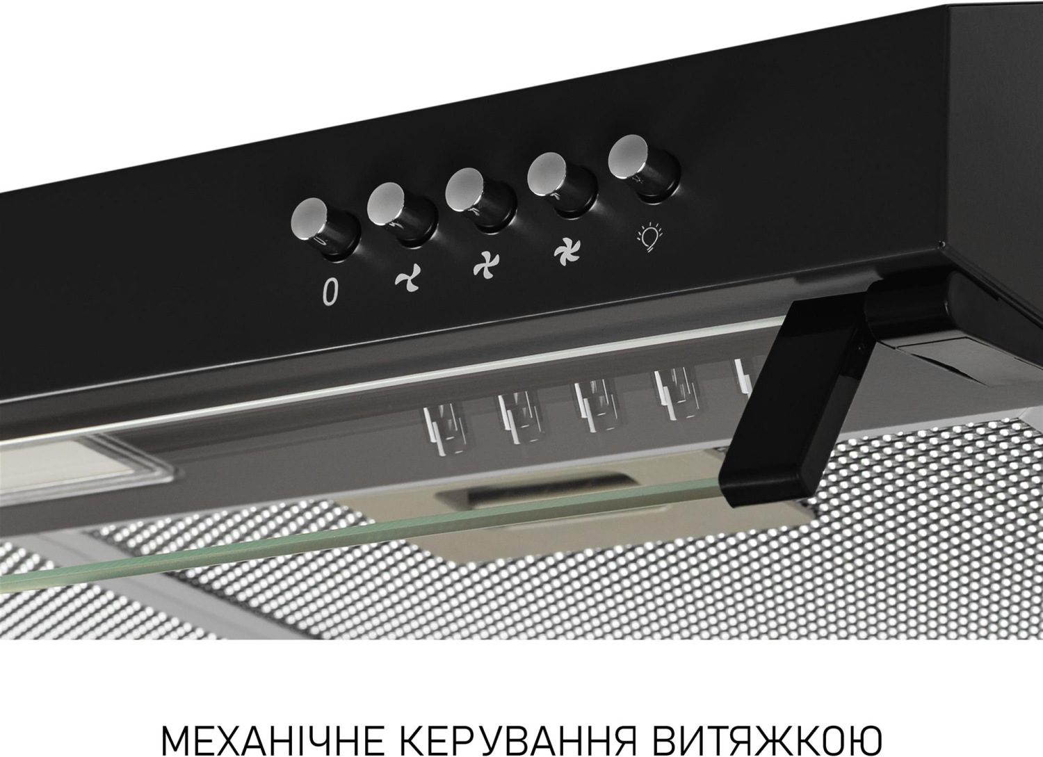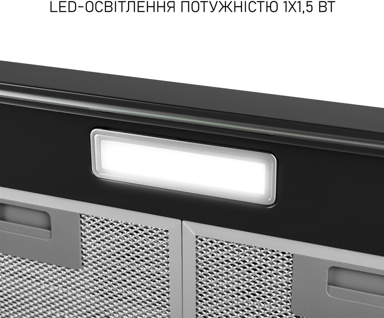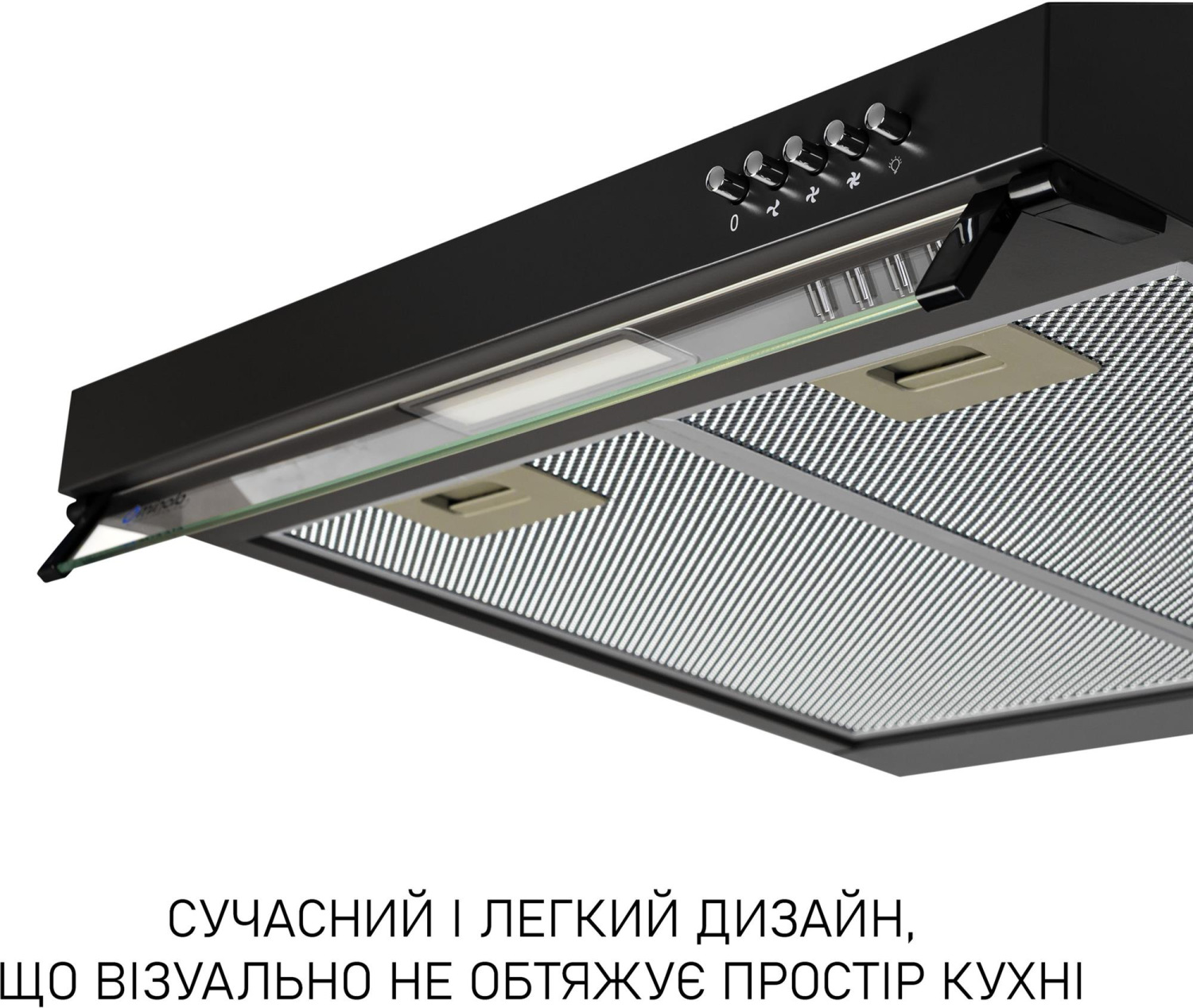 Minola HPL 522 BL — це стильна та компактна плоска витяжка, яка поєднує потужність і витонченість. Скляний козирок та глибокий чорний колір роблять її елегантним акцентом у будь-якому інтер’єрі, а продуктивність 450 м2/год дозволяє підтримувати чистоту повітря навіть на кухнях до 15 м2. Модель вирізняється зручним механічним керуванням, LED-підсвіткою та можливістю роботи в режимах відведення і рециркуляції. Вона створена для тих, хто цінує простоту, якість і стиль у кожній деталі.
