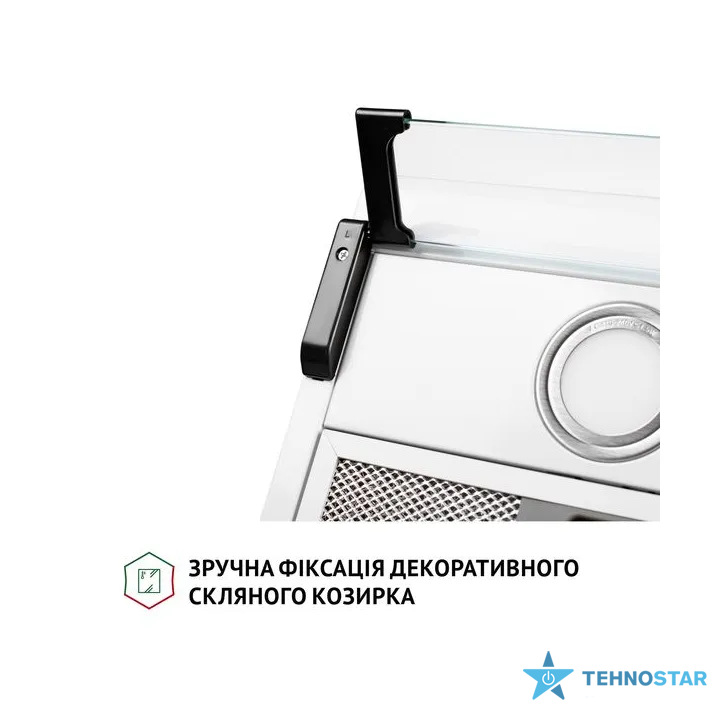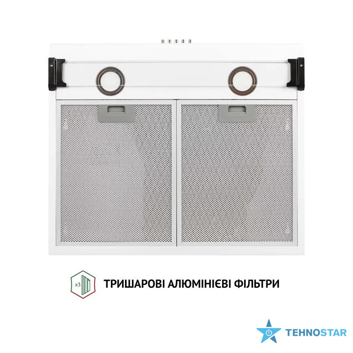 Надійність також закладена в конструкцію: двошарові алюмінієві жирові фільтри затримують жир та випари, захищаючи внутрішні елементи витяжки, а легкий доступ до фільтрів спрощує їх очищення.