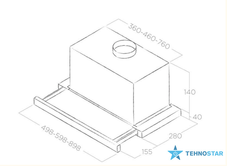 Корпус витяжки виконаний з нержавіючої сталі і декорований чорною скляною панеллю. У комплекті з пристроєм є алюмінієвий жировий фільтр грубої очистки, який затримує частинки жиру і захищає витяжку від забруднень і зниження продуктивності з часом. При неможливості організації виведення повітря з приміщення, необхідно додатково придбати вугільний фільтр тонкого очищення, тоді витяжка може працювати в режимі рециркуляції, повертаючи очищене повітря назад на кухню.